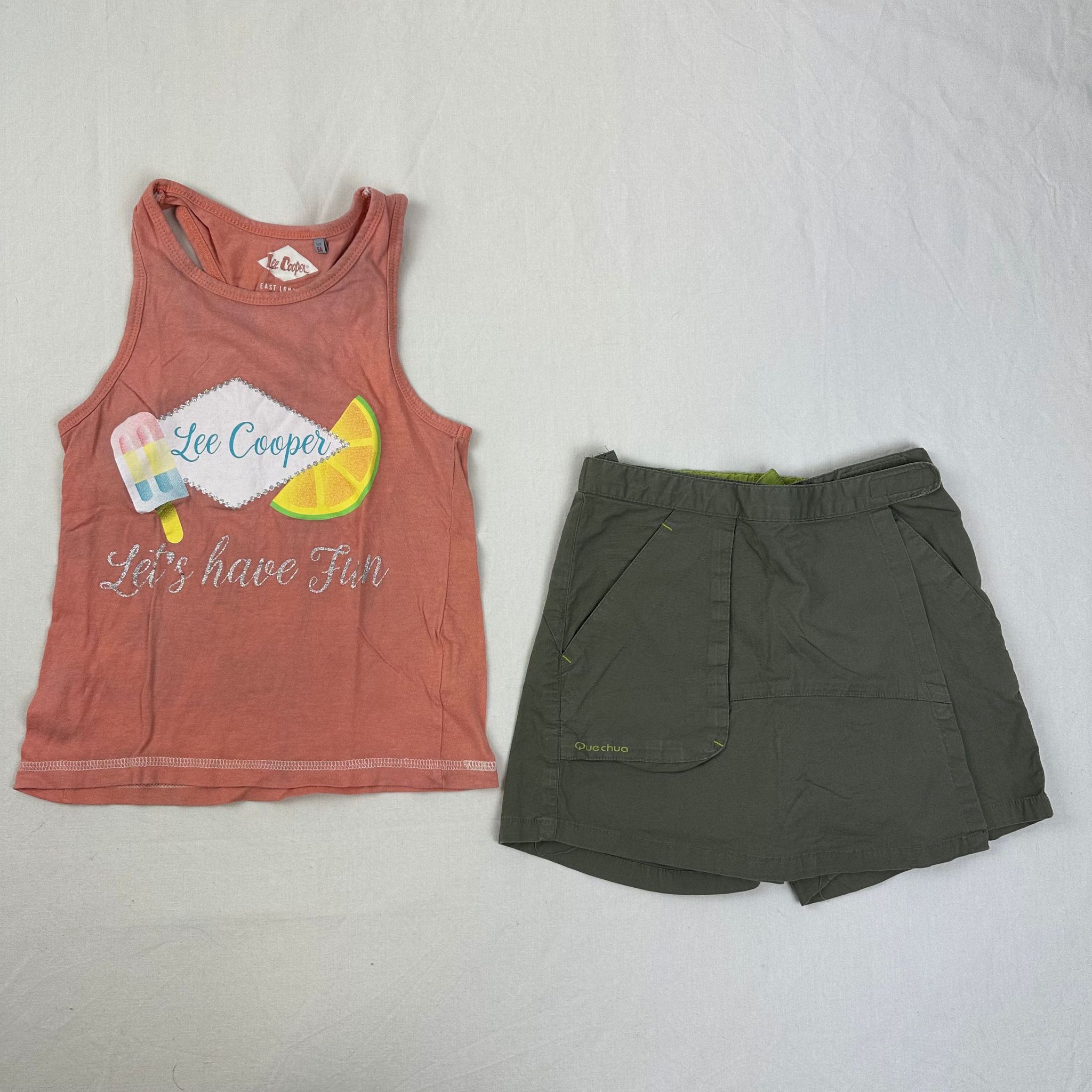 Autres commentaires : T-shirt sans manches Lee Cooper rose sans manches avec motif centrale « let’s have sun ».Jupe Decathlon vert avec taille élastiquée et ceinturée.