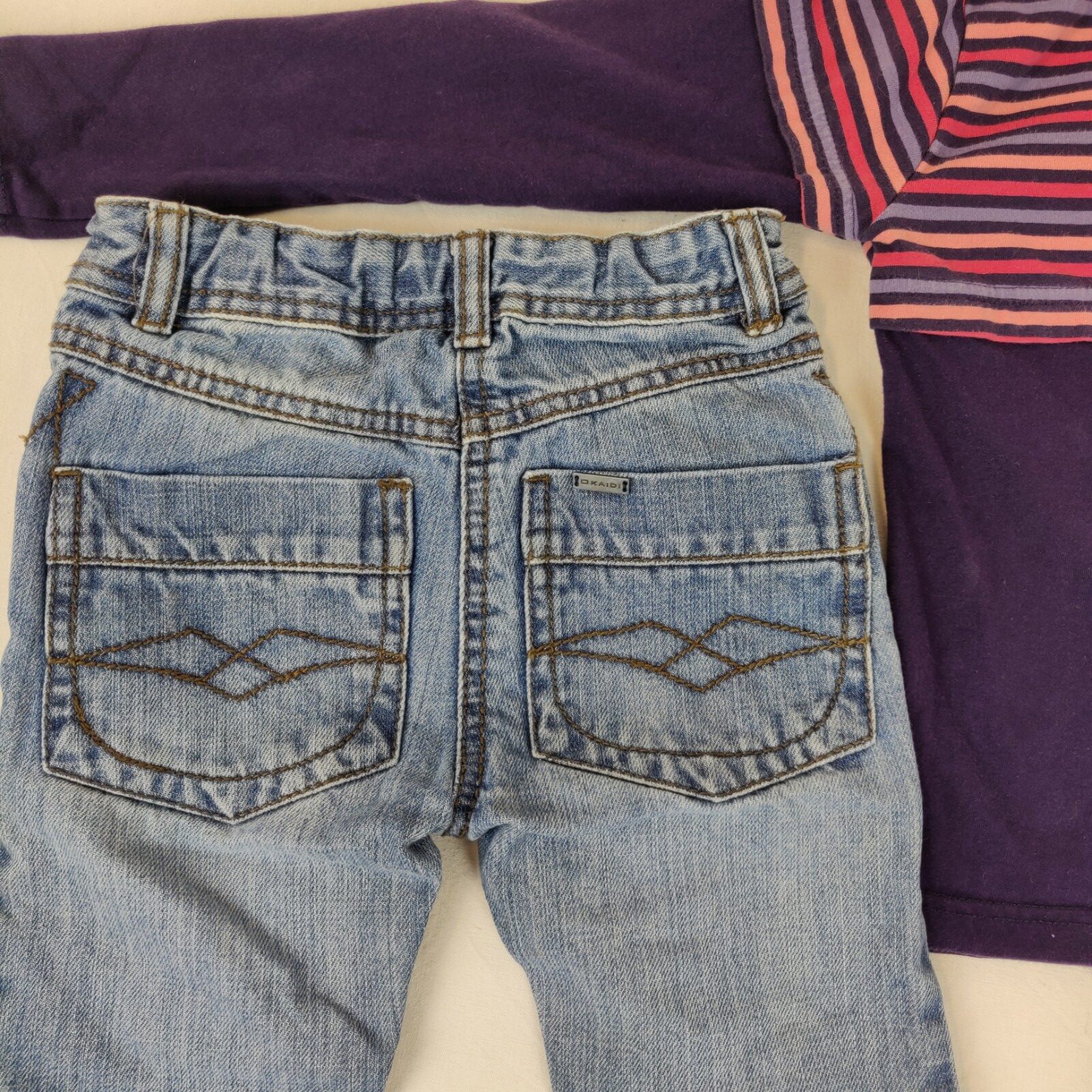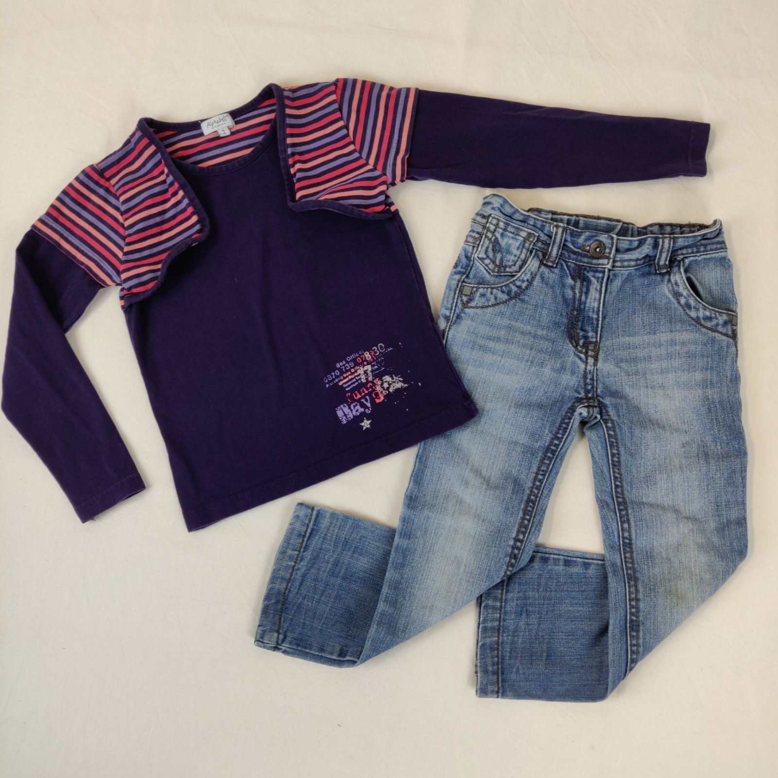 Autres commentaires : 6% élasthanne. Ensemble 2 pièces. Un t-shirt à manches longues Alphabet Création – violet. Partie supérieure façon boléro violet rayé saumon, rose et parme. Un jean Okaïdi en denim bleu. Coutures marrons apparentes. Taille ajustable. 2 poches latérales et 2 poches arrières. Passants pour une ceinture. Marques d’usure au niveau des jambes.