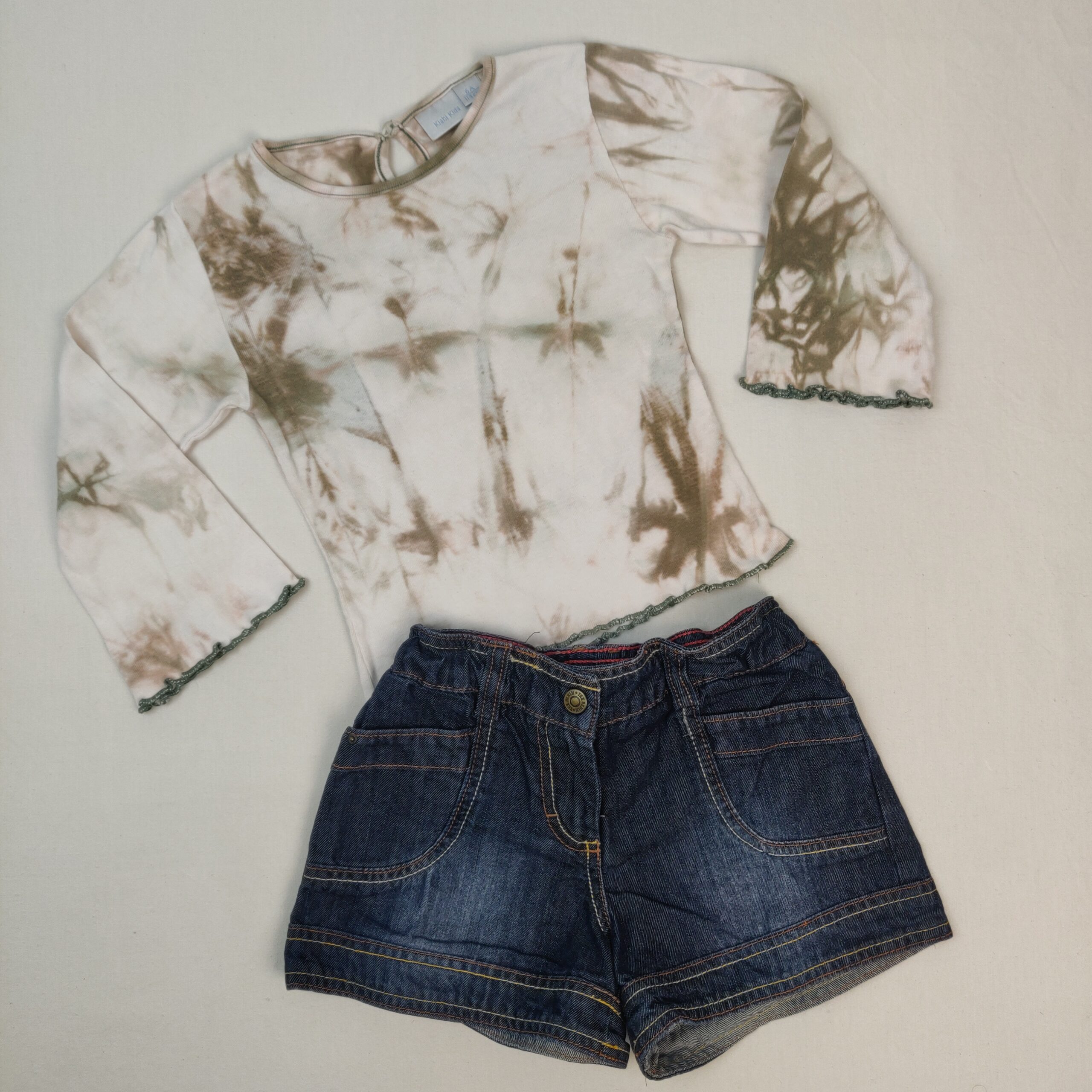 Autres commentaires : Ensemble 2 pièces : t-shirt beige KIABI manches longues, col rond, motif impression style sepia, manches un peu forme trompette, fermeture par bouton en haut du dos et short en jeans TEX Kids, en denim bleu foncé, ceinture ajustable par élastique intérieur, fermeture devant par bouton et zip.