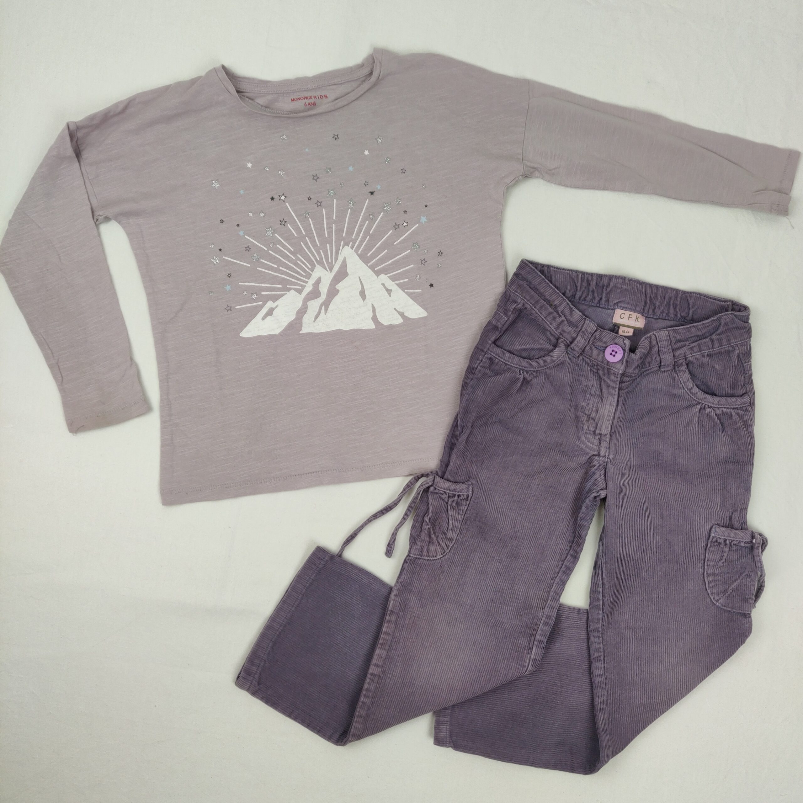 Autres commentaires : T-shirt manches longues Monoprix violet imprimémontagne, pantalon CFK