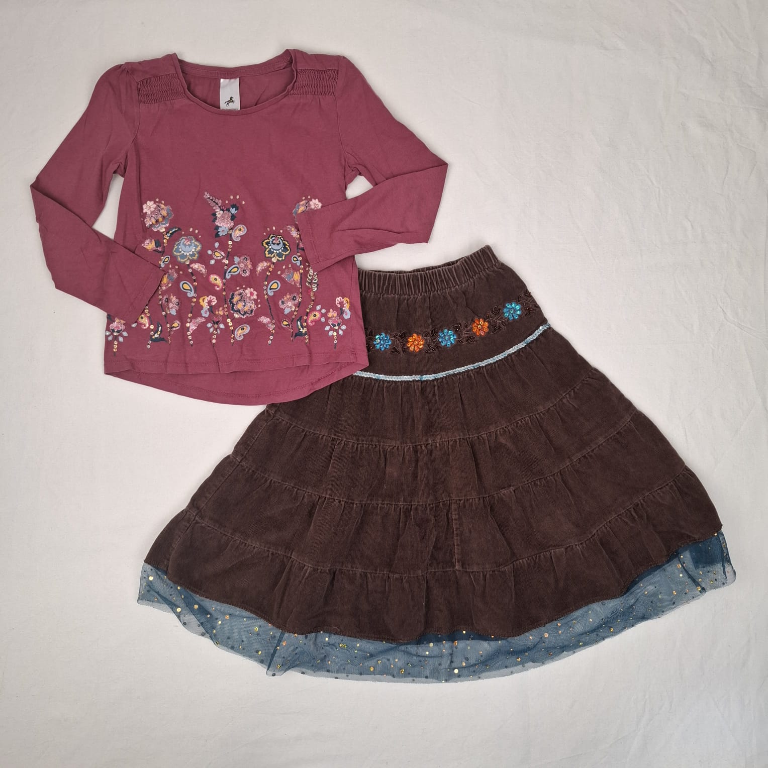 Autres commentaires : Ensemble 2 pièces : -T-shirt C&A rose foncé à manches longues, motif floral avec paillettes, col rond. – Jupe sans marque en velours côtelé marron, motif floral avec paillettes, volant en tulle bleu à pois dorés en bas, taille élastiquée.