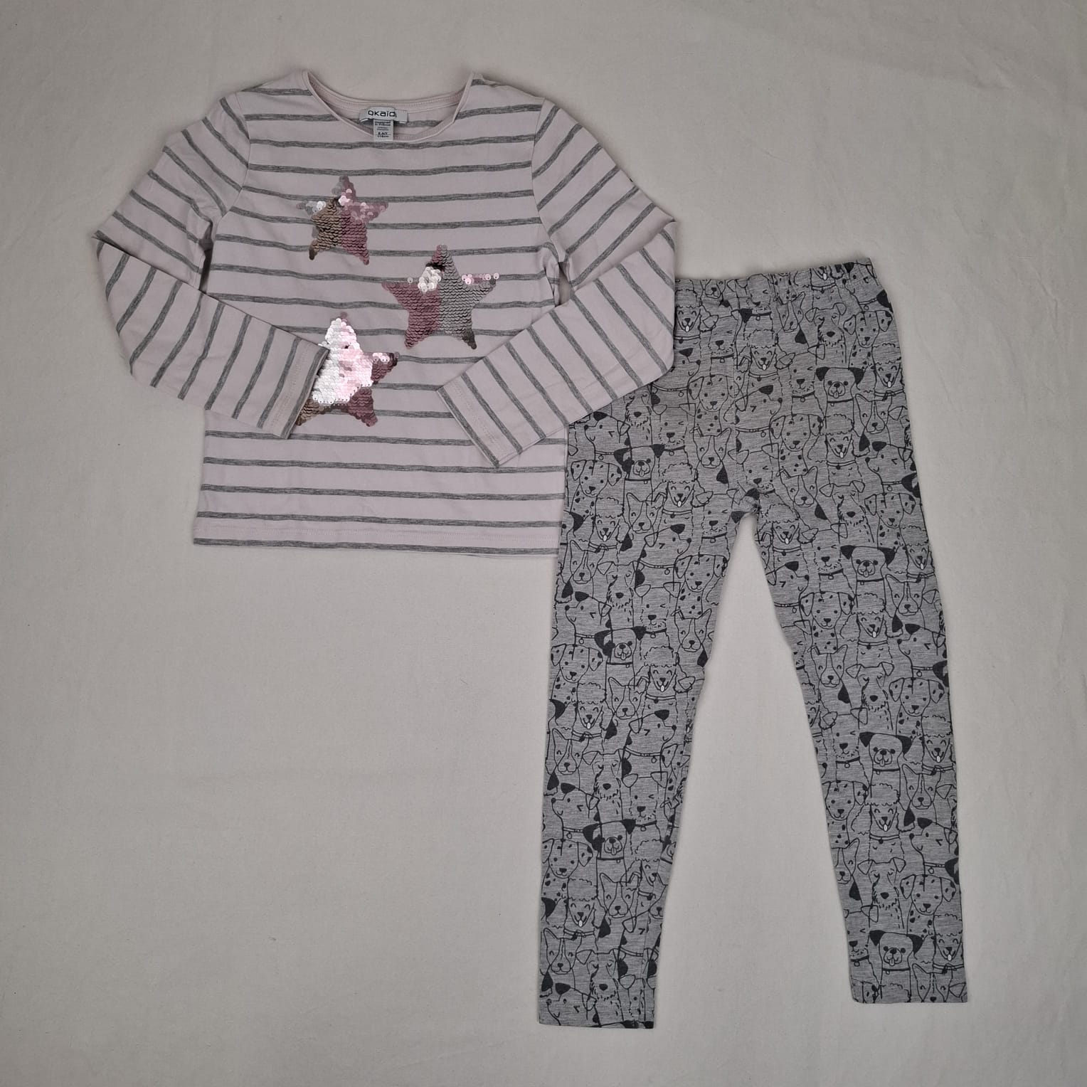 Autres commentaires : Ensemble 2 pièces : T-sirt Okaïdi rose clair à manches longues, motif étoiles rose en sequins, col rond. -Legging TU gris, motifs chiens, taille élastique, 90% coton; 5% viscose, 5% élasthanne.
