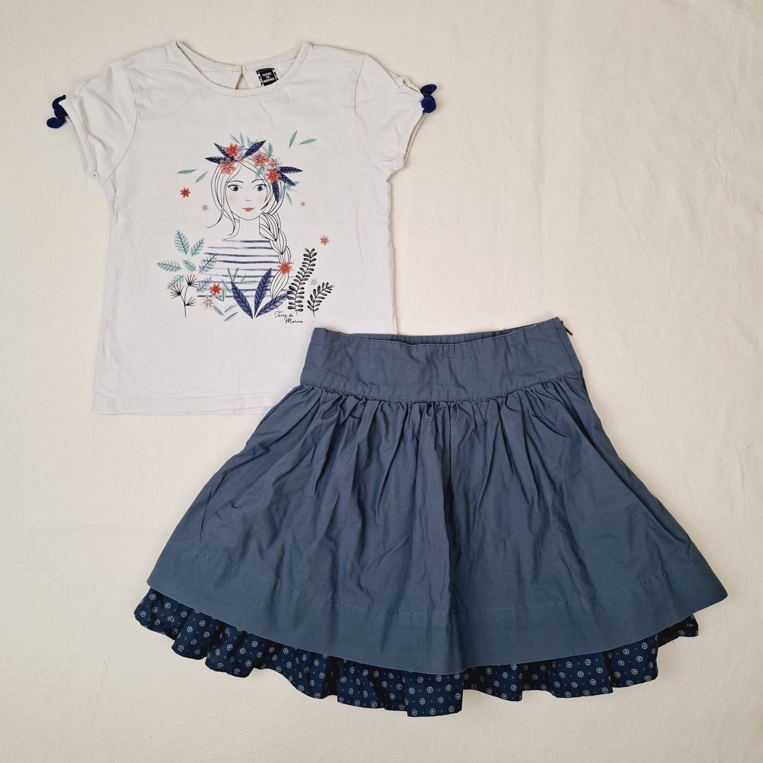 Autres commentaires : Ensemble 2 pièces: -T-shirt TERRE DE MARINS blanc à manches courtes, motif fille, col rond, noeuds bleus sur les manches, fermeture par outon au dos. -Jupe bleu VERTBAUDET , large taille, fermeture par zip, doublure en jupon