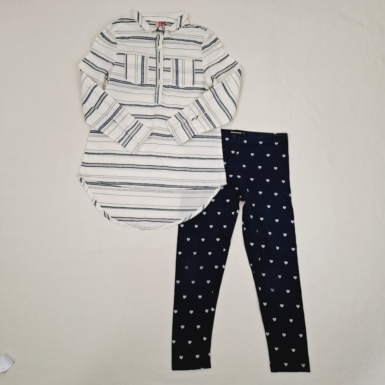 Autres commentaires : Ensemble 2 piéces : – Tunique blanc cassé ORCHESTRA à manches longues, à rayures bleu ardoise, col chemise, bas arrondi et plus long derrière, fermeture devant par boutons à l’encolure, minuscule tache au niveau de la manche gauche – Legging bleu foncé INEXTENSO, imprimé petits coeurs mauves, taille élastiquée, 95% coton et 5% élasthanne.