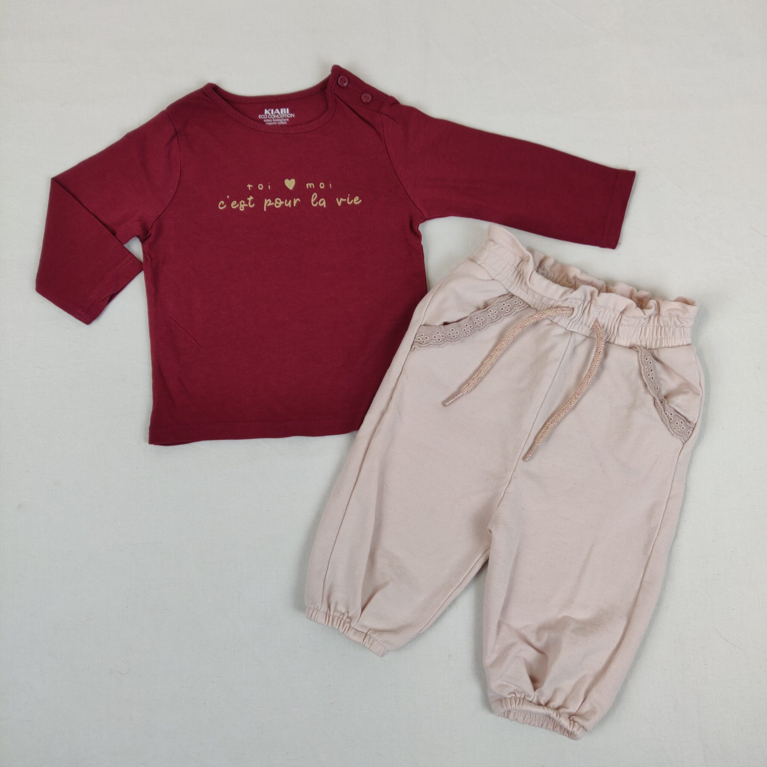 Autres commentaires : T-shirt Kiabi rouge bordeaux manches longues avec un dessin dorée dans le plastron.Jogging Vertbaudet rose avec taille élastiquée.