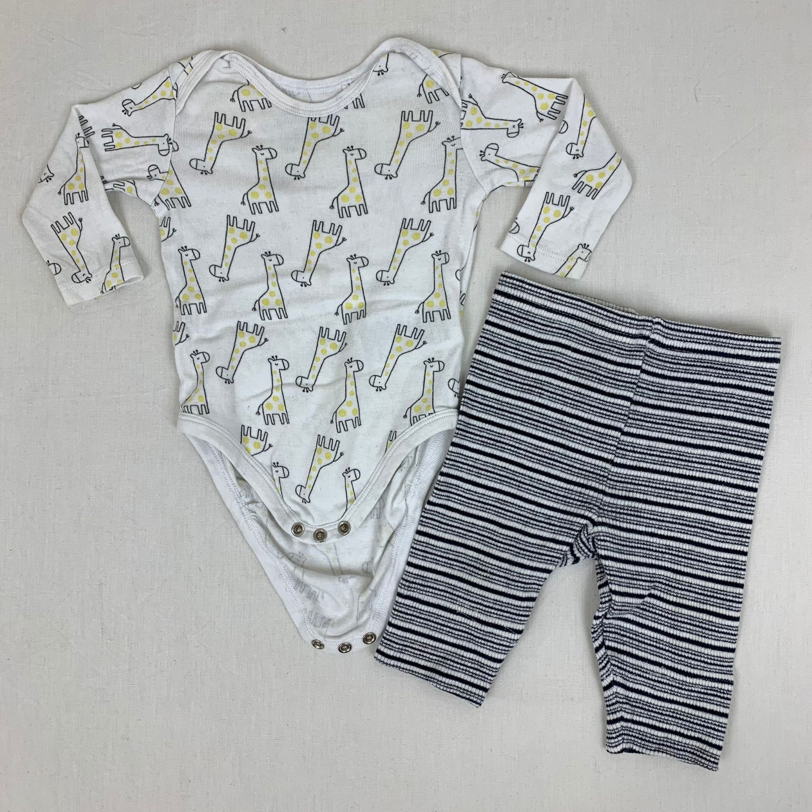 Autres commentaires : Body manches longues blanc avec motif des giraffes. Legging blanc avec rayures bleu foncé et taille élastiquée. Contient 96% coton et 4% spande.