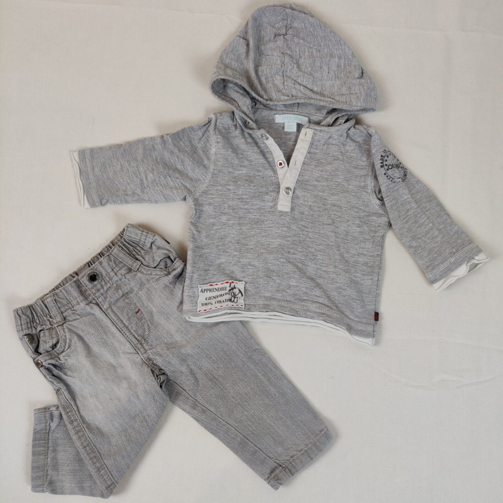 Autres commentaires : 5% viscose. Ensemble 2 pièces. T-shirt à manches longues et à capuche Obaïbi gris chiné. Ouverture centrale sur fond blanc à 3 boutons. Ecusson blanc cousu à la taille avec l’inscription noire « Apprendre la générosité 100% Obaïbi ». Ecusson noir Obaïbi dans le haut de la manche gauche. Jean en denim gris Orchestra. Taille élastique. 2 poches latérales et 2 poches arrières. Passants pour une ceinture. Très légères traces d’usure sur le devant.