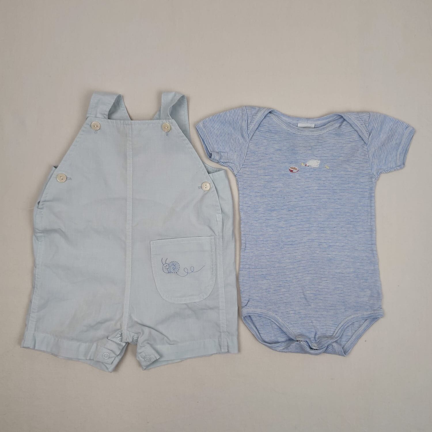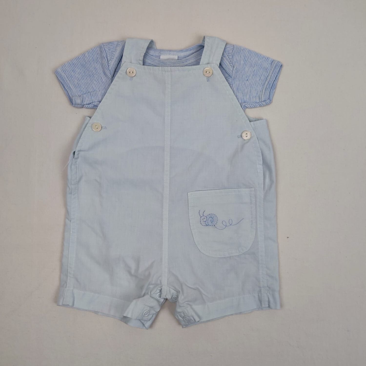Autres commentaires : Ensemble 2 pièces : – Body manches courtes à rayures blanches et bleues PETIT BATEAU, motif poule et poussins, 100% coton. – Salopette courte et bleu très pâle PRINTEMPS, motif escargot brodé devnet ton-sur-ton, 50% coton et 50% polyester, fermeture des bretelles et des côtés par boutons et à l’entrejambe par boutons pression.