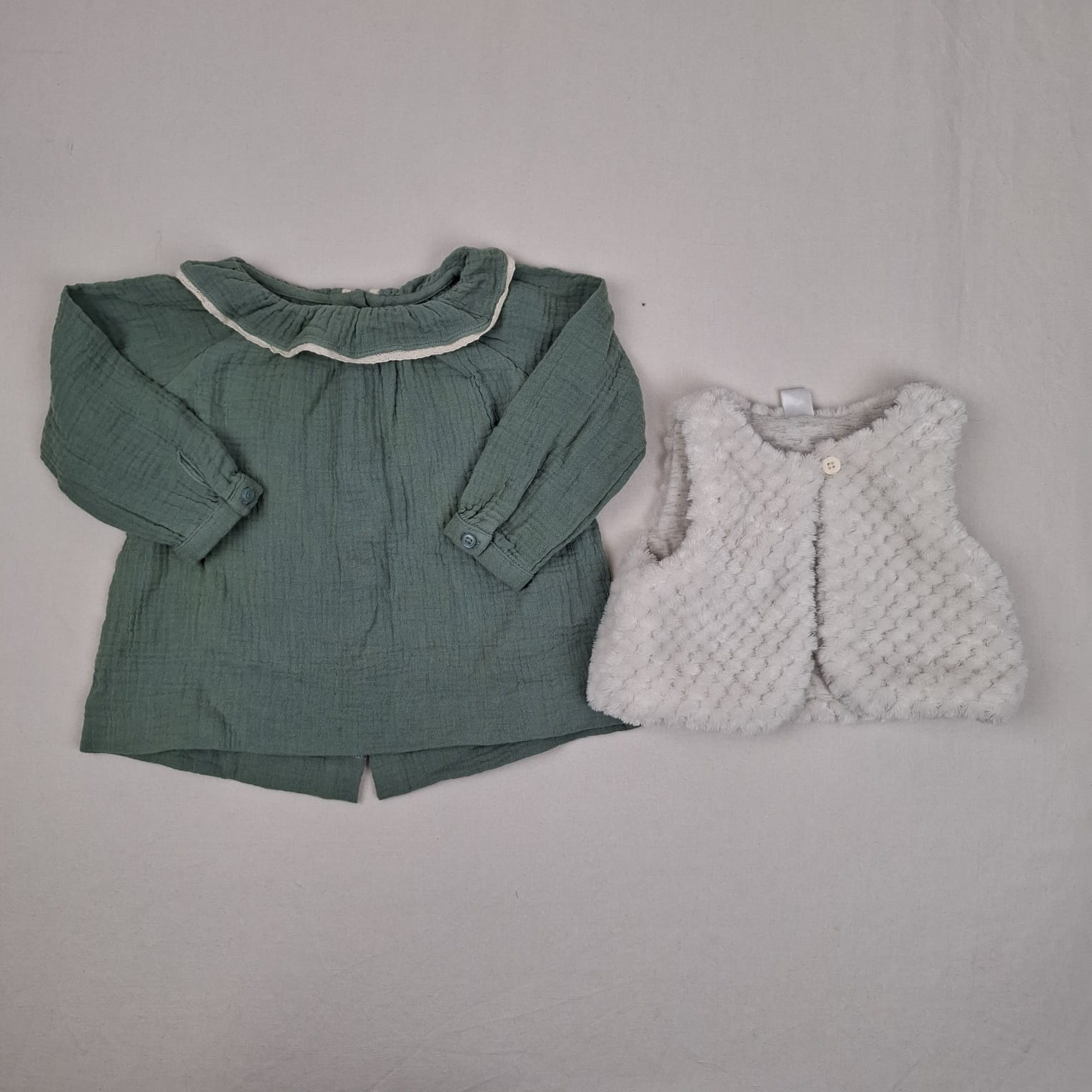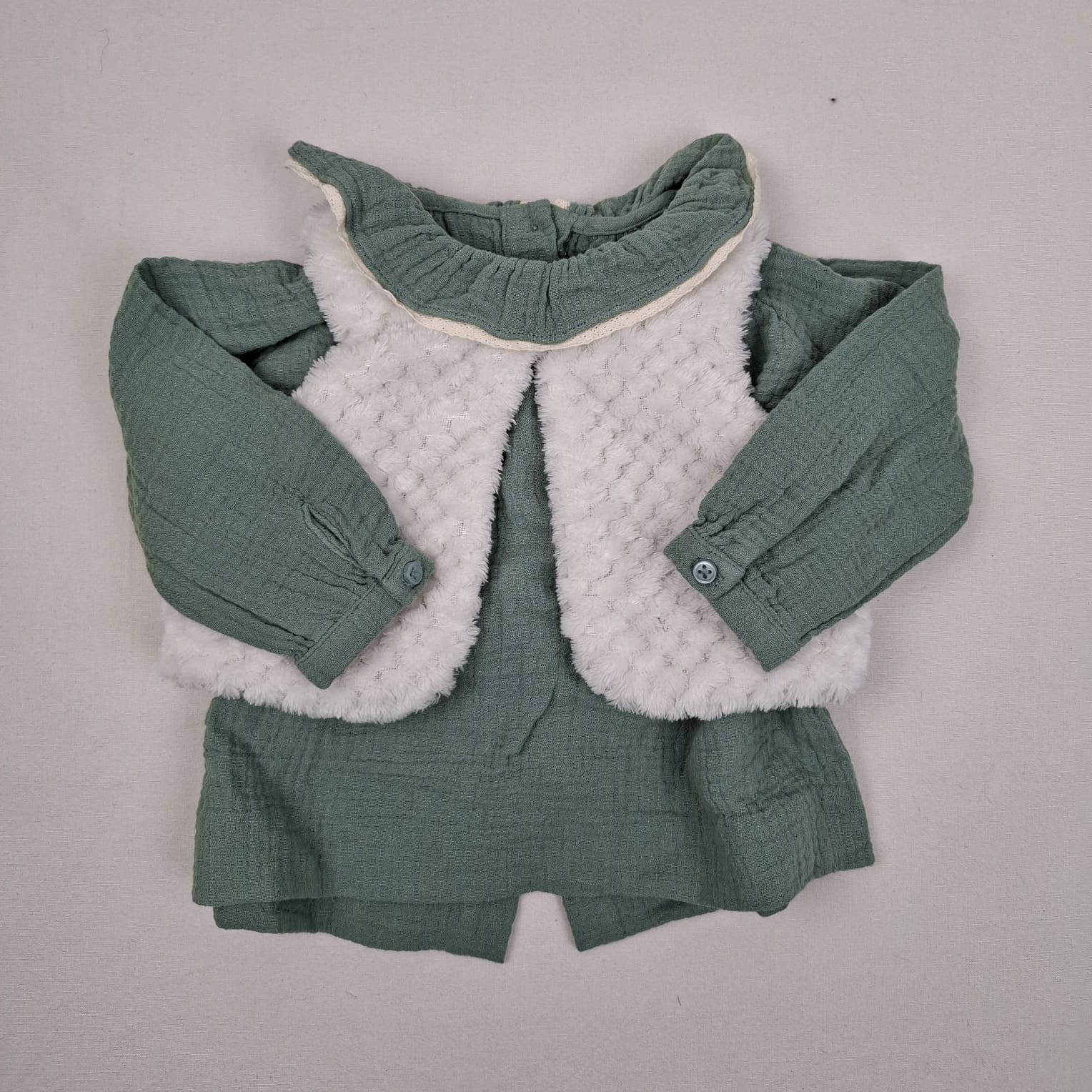 Autres commentaires : Ensemble 2 pièce: – Gilet blanc, sans manches, Tex Baby, doublé, un bouton pour ouvrir le gilet. – Robe verte, col claudine avec un peu de dentelle, tissus molleton, boutons à l’arrière du vêtement pour ouvrir le col,