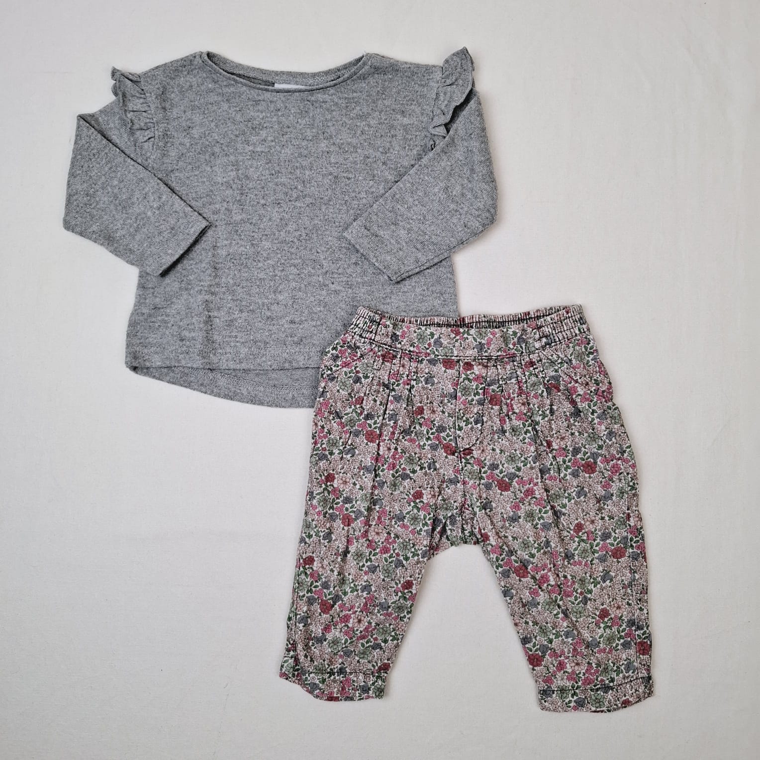 Autres commentaires : Ensemble 2 pièces: -Sweat ZARZ gris uni à manches longues, col rond, les volants sur les épaules. -Pantalon Baby Gap en velours côtelé, motif floral, taille élastique.