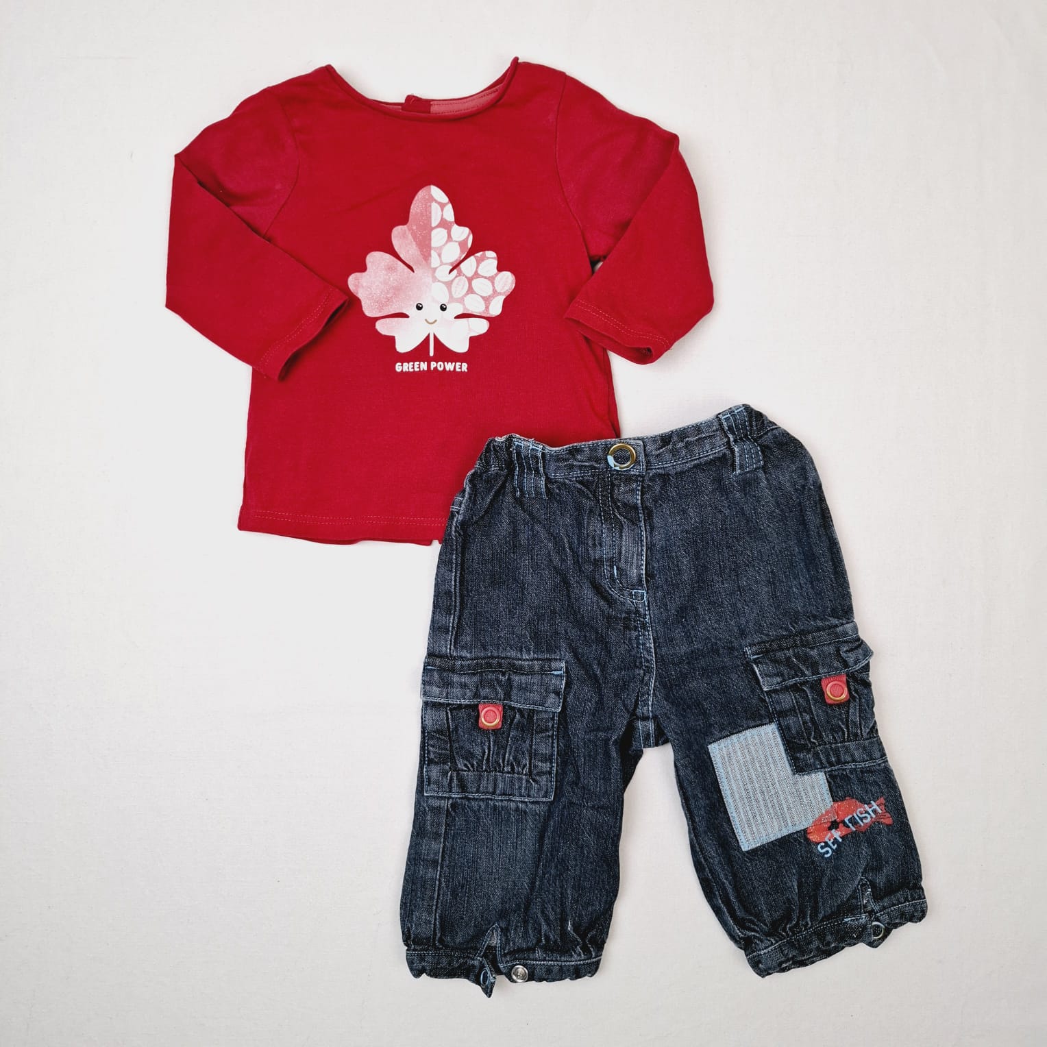 Autres commentaires : Ensemble 2 pièces: -T-shirt OBAIBI fushia à manches longues, motif feuille et inscription « Green power », col rond. -Jean TEX bleu foncé, fermeture par zip eu bouton pression, fermeture par boutons pression en bas de jame, taille élastique, multi-poches, bouton cassé en bas de la jambre gauche du pantalon.