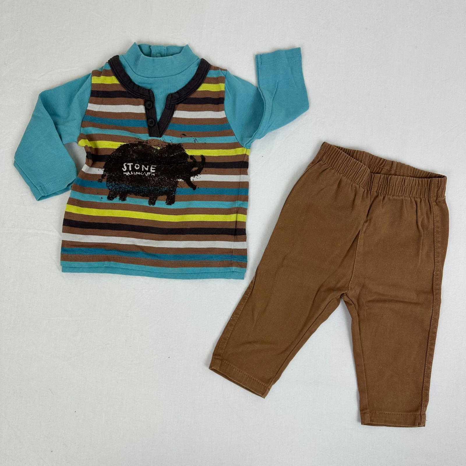 Autres commentaires : T-shirt manches longues bleu avec col cheminé, rayures au milieu marron,blanc et bleu et une fermeture au dos par boutons pressions.Pantalon marron sans marque avec taille élastiquée.