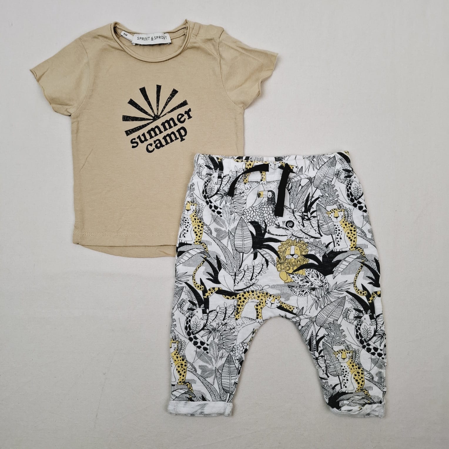 Autres commentaires : Ensemble 2 pièces: – T-shirt Sproet & Sprout beige à manches courtes, inscription « Summer camp », fermeture par boutons sur l’épaule gauche. – Pantalon en molleton blanc, motifs feuilles noir avec tigre et lion, taille élastique.