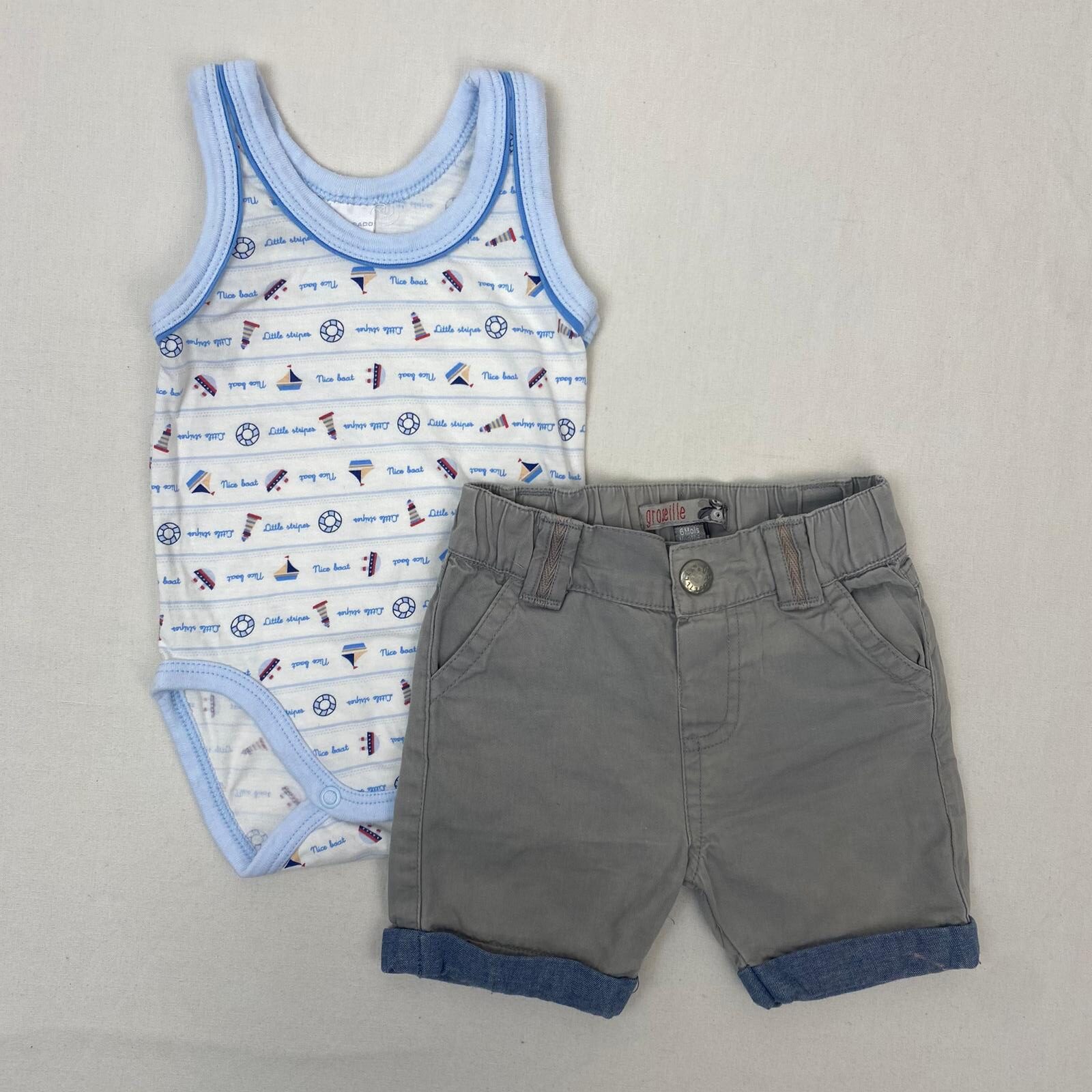 Autres commentaires : Ensemble 2 pièces: – Body Abanderado blanc sans manches, motif marine. – Short beige GROSEILLE retroussé, taille élastique.