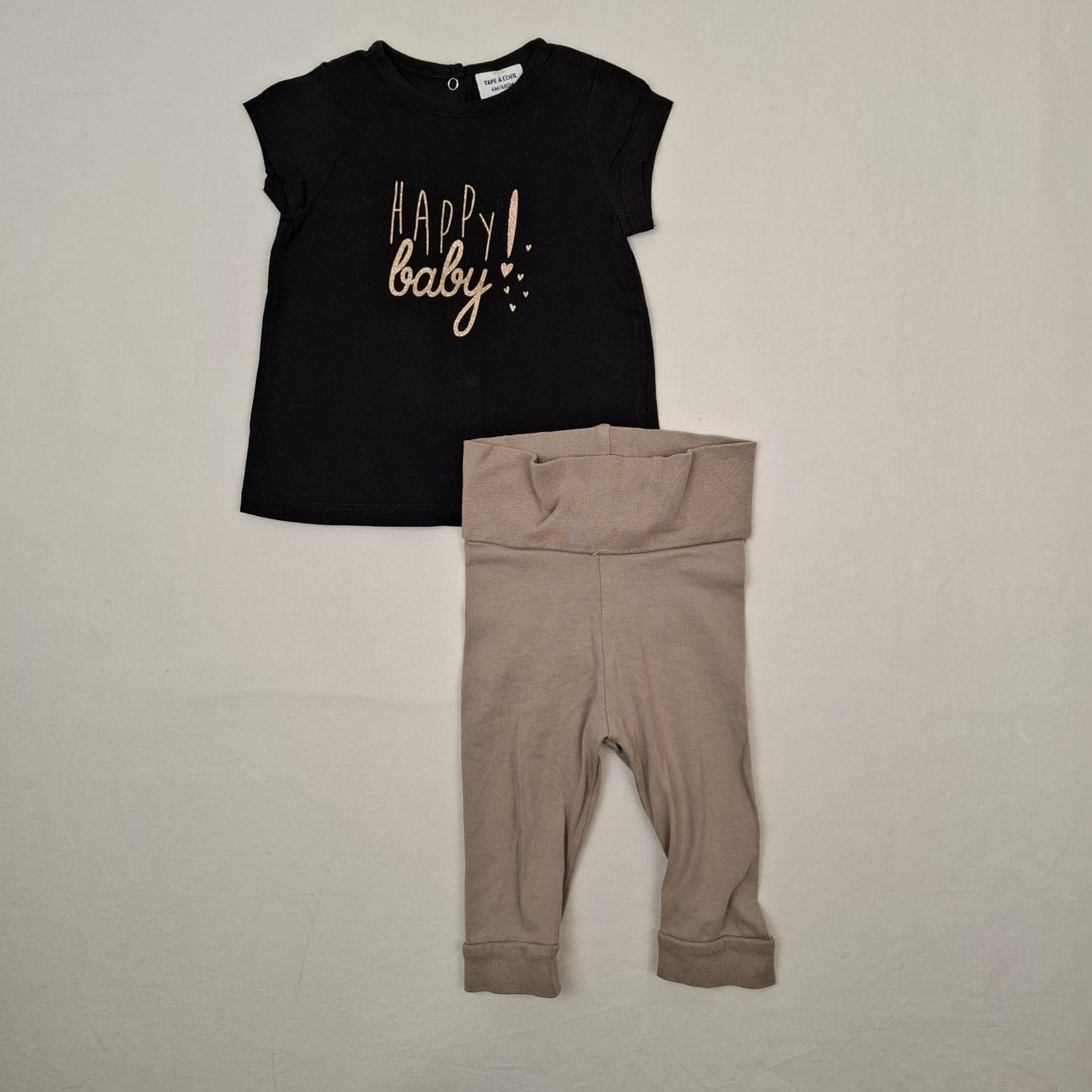 Autres commentaires : Ensemble 2 pièces : – T-shirt manches courtes Tape à l’oeil, noir avec devant, inscription dorée « Happy Baby », fermeture complète au dos par boutons pression. – Legging couleur taupe H&M, taille élastiquée, chevilles en bord côte, 95% coton et 5% élasthanne.