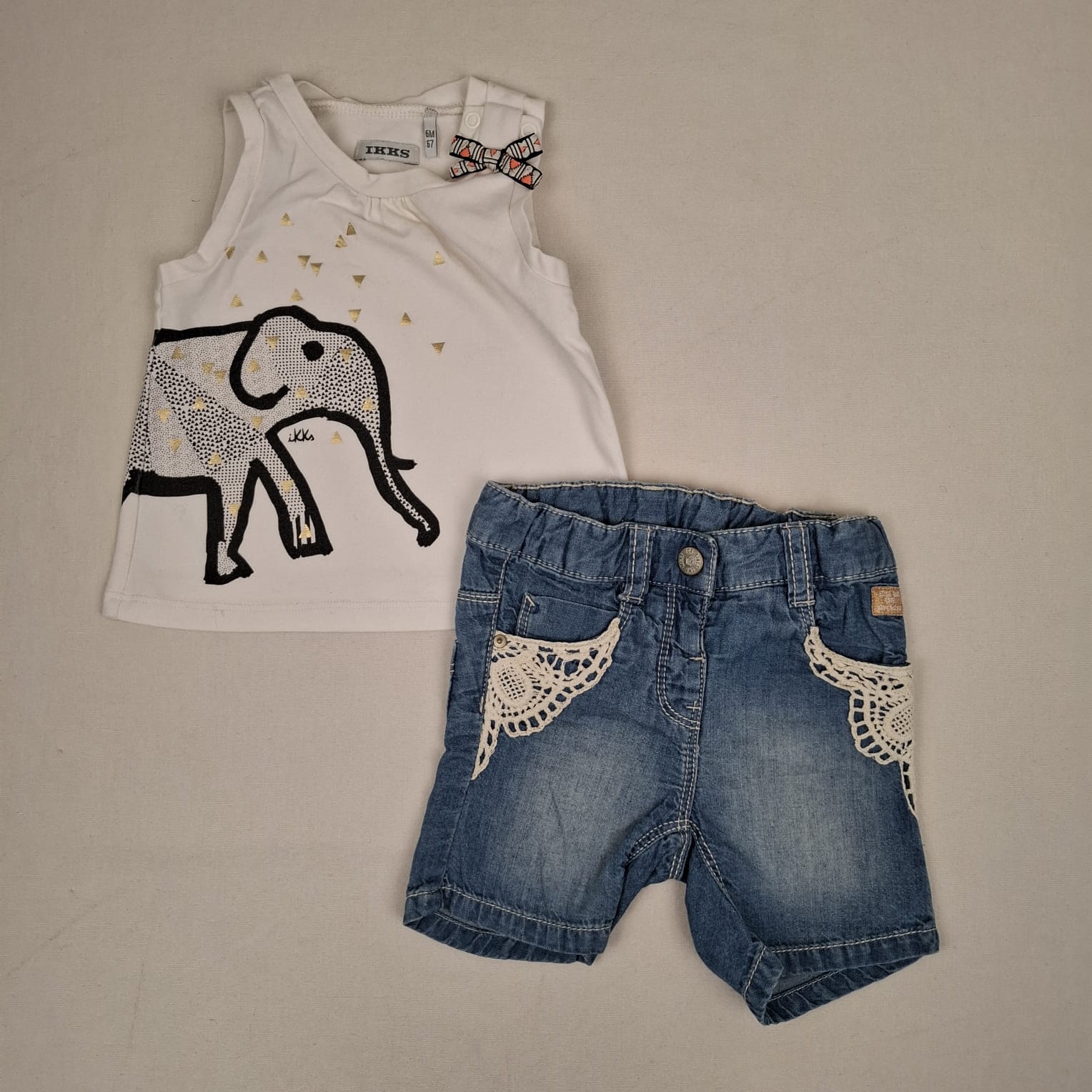 Autres commentaires : Ensemble 2 pièces : – Short en jeans bleu Mexx, taille réglable par élastique intérieur, détails de broderie écrue devant, fermeture devant par un bouton pression, 100% coton. – Débardeur blanc IKKS, sans manches, sur tout le côté droit, illustration d’éléphant aux motifs géomériques noirs, entouré de triangles dorés, fermeture par bouton pression à l’épaule gauche avec petit noeud décoratif blanc à motifs noirs et roses, froncé devant au niveau du col rond.