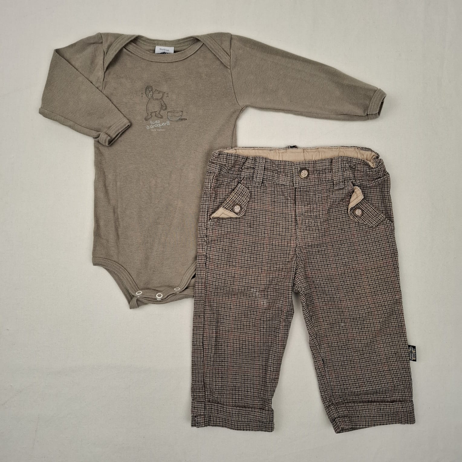 Autres commentaires : Ensemble 2 pièces: – Body Petit Bateau vert kaki à manches longues, motif chat, col US. – Pantalon Sergent Major, motif carreaux pied de poule, ceinture ajustable par élastique intérieur, fermeture par bouton pression.