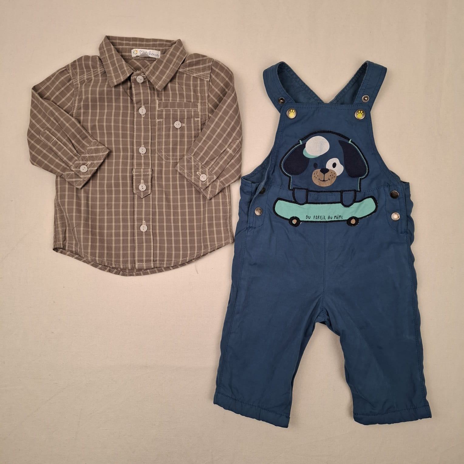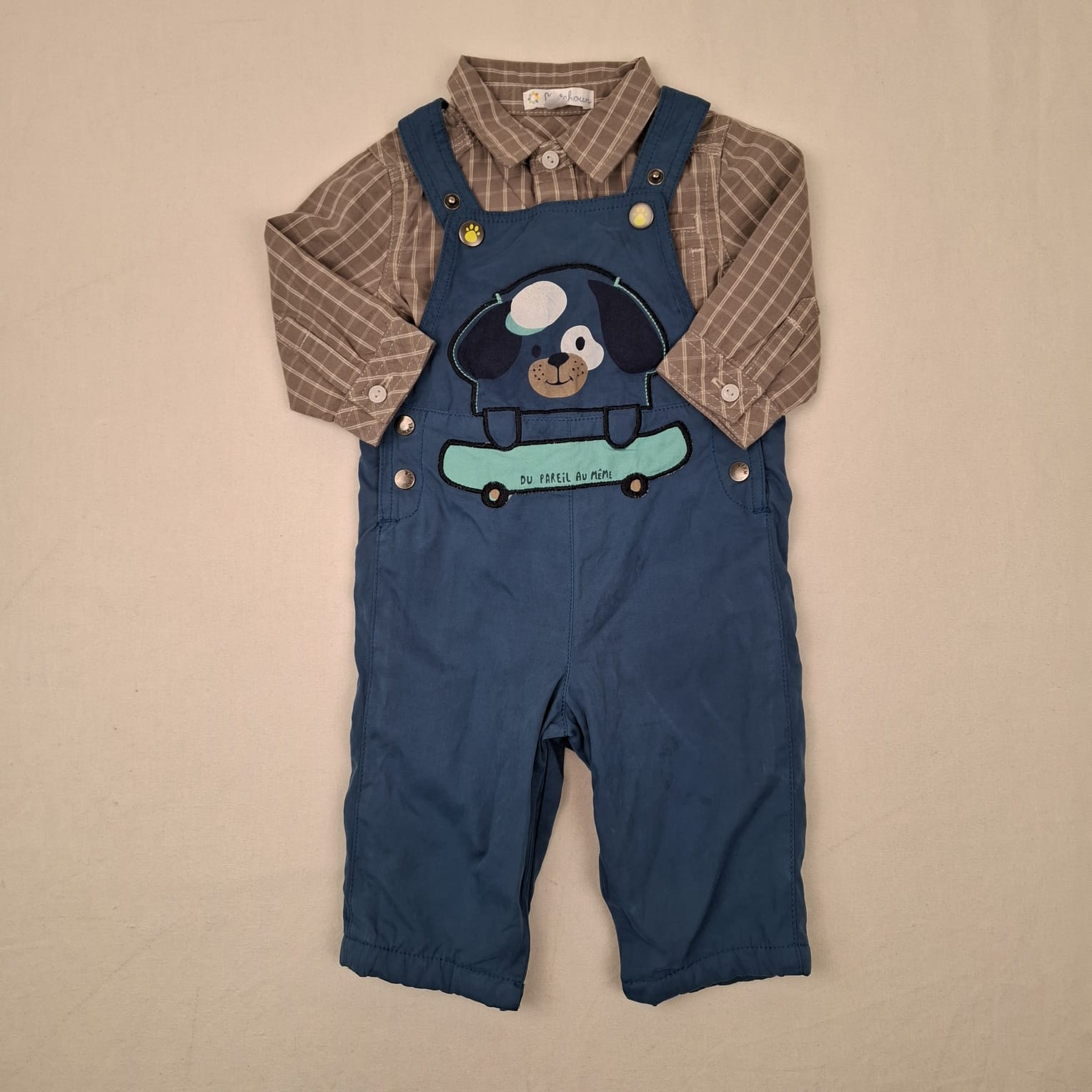 Autres commentaires : Ensemble 2 pièces : – Salopette bleue DPAM, devant motifs tête de chien et skateboard de couleur vert clair, hauteur des bretelles réglables par boutons pression, fermetures latérales et à l’entrejambe par boutons pression, doublure bleue en 100% coton, tissu extérieur en 56% polyester, 32% coton et 12% polyamide. – Chemise manches longues Kitchoun, à carreaux beige foncé et crème, fermeture devant et aux poignets par petits boutons, 100% coton.