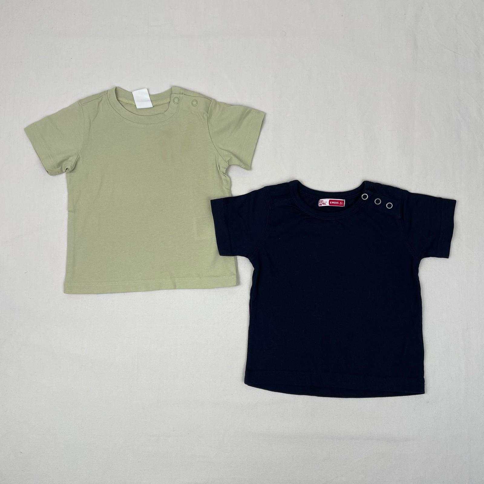 Autres commentaires : Lot de 2 T-shirts unis manches courtes, fermeture à l’épaule gauche par boutons pression : – Un bleu nuit DPAM. – Un vert anis clair H&M.