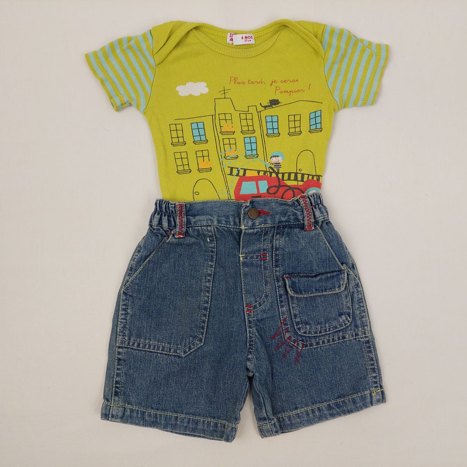 Autres commentaires : Body Du Pareil au Même jaune vert imprimé pompier, short FB DIffusion en jean bleu