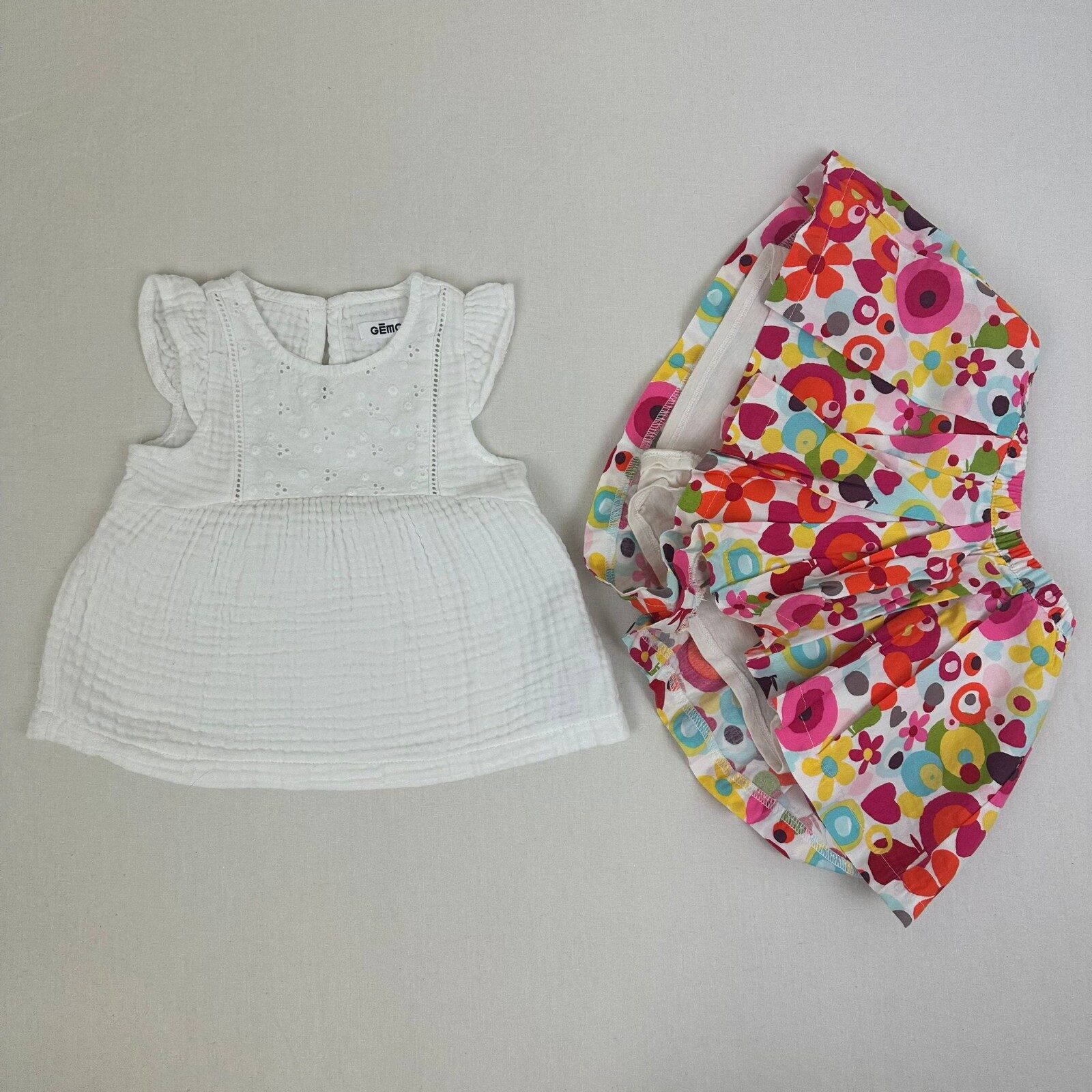 Autres commentaires : T-shirt Gemo manches courtes avec une fermeture par boutons au dos. Jupe culotte Du pareil au même courte multicolores avec taille élastiquée.
