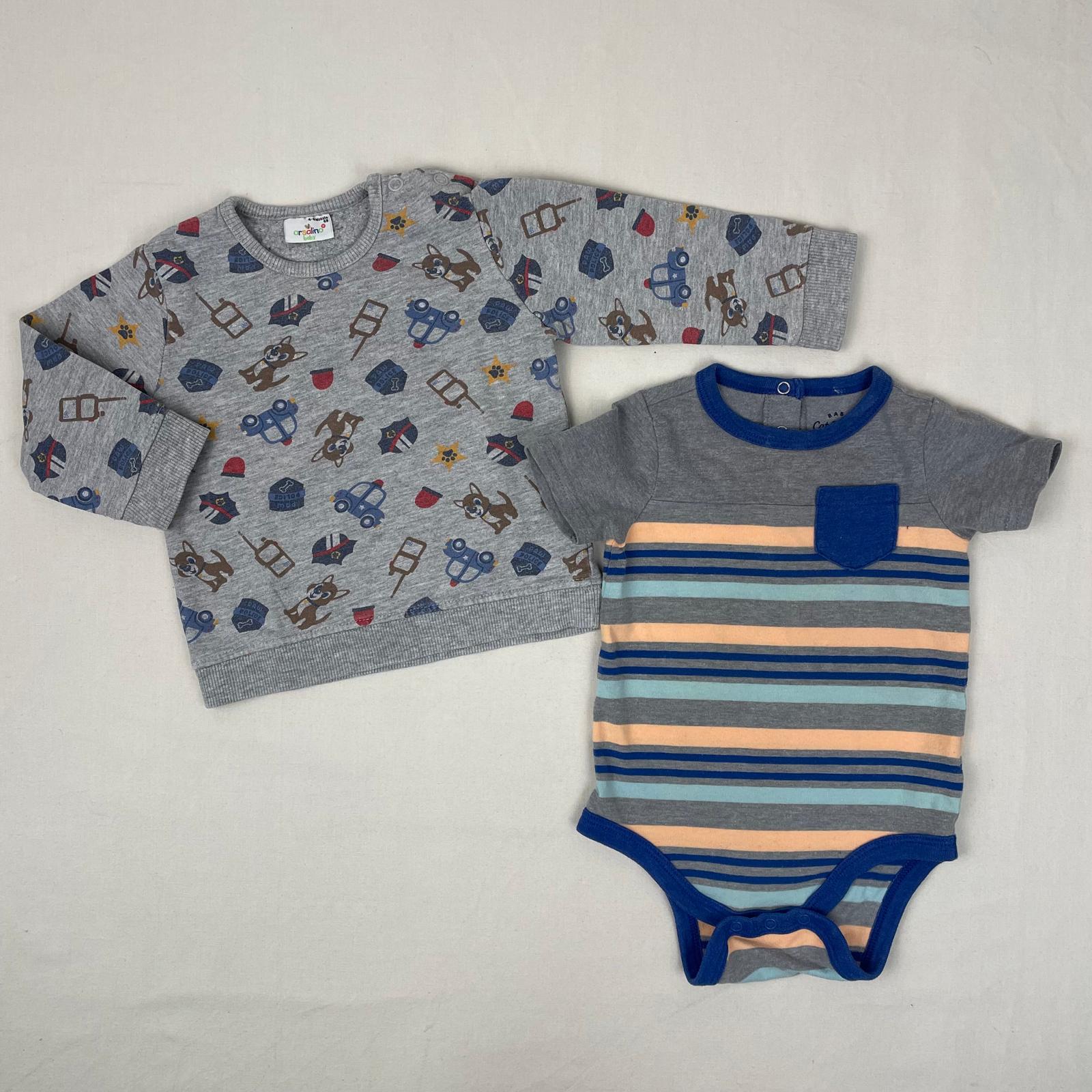 Autres commentaires : Ensemble 2 pièces : -1 body Cat & Jack à manches courtes gris à rayures bleues et oranges, avec boutons pression à l’entrejambe et derrière au col ; -1 pull gris Orsolino avec des imprimés de chiens et de la police, col, manches et bas élastiqués.