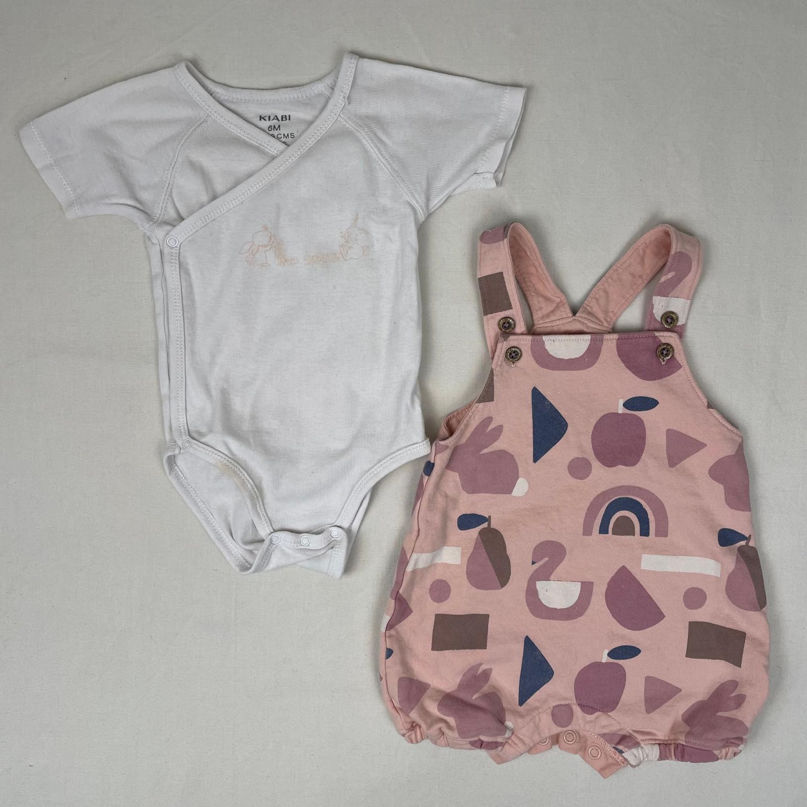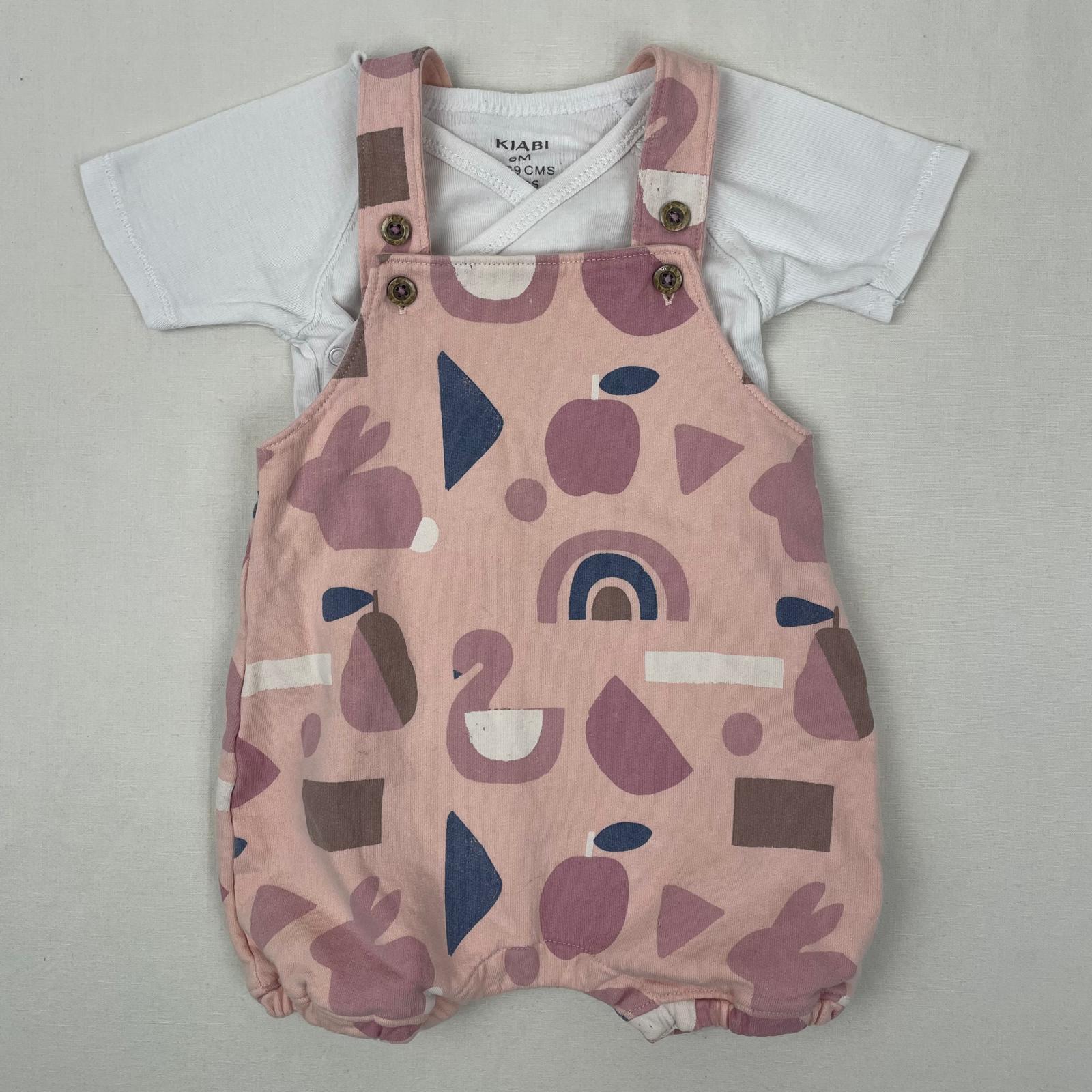 Autres commentaires : Ensemble 2 pièces : -1 body offert Kiabi blanc à ouverture croisée en boutons pression, manches courtes, boutons pression à l’entrejambe, motif rose de 2 lapins jouant aux cubes devant, taches dans le dos et à la jambe droite ; -1 barboteuse rose à motifs géométriques, avec fruits et animaux, boutons aux épaules pour les bretelles, boutons pression à l’entrejambe, tour de cuisse élastiqué.