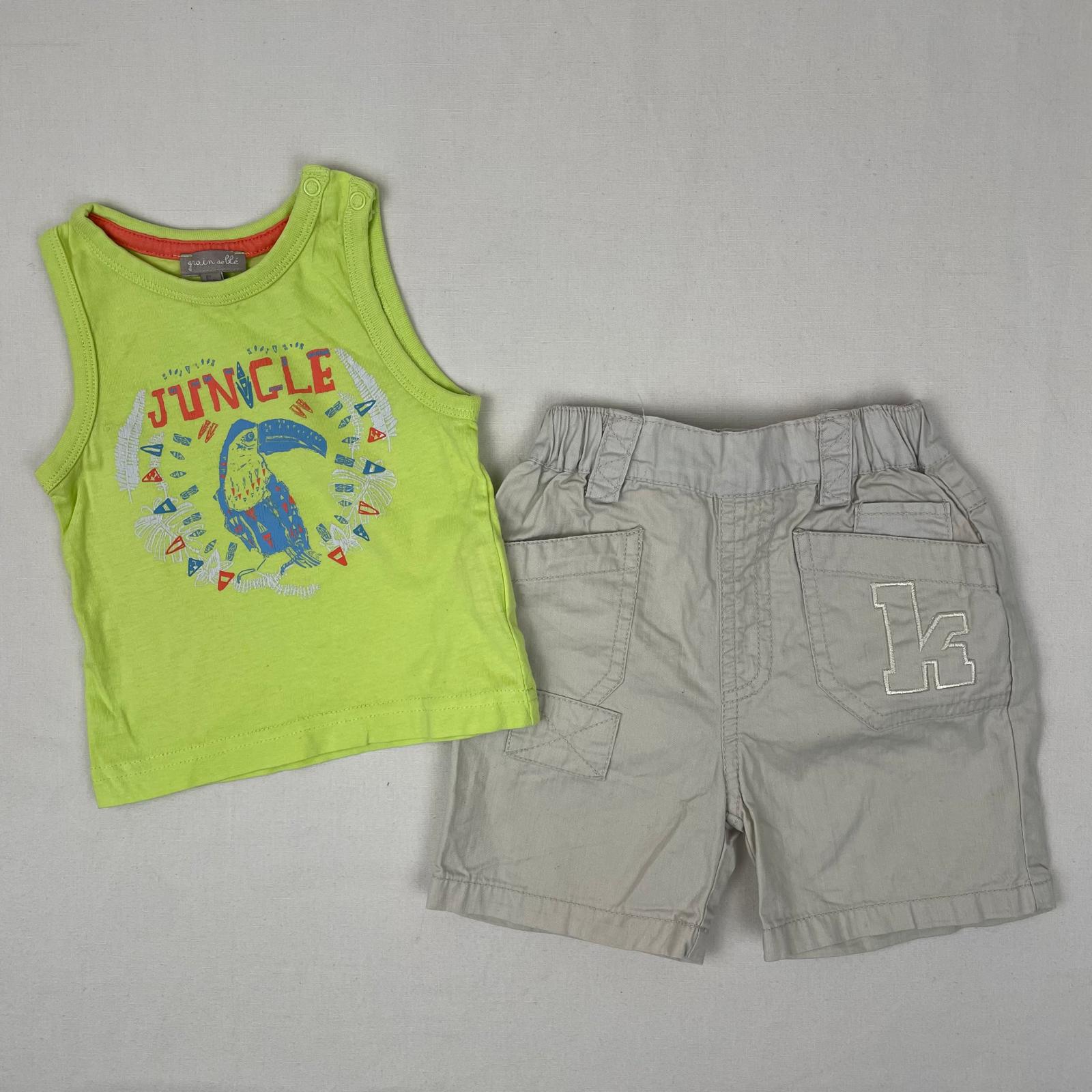 Autres commentaires : Ensemble 2 pièces : -1 débardeur jaune fluo Grain de blé avec un toucan devant et l’inscription « Jungle » ; -1 short Kitiwatt crème avec taille élastiquée, fausse braguette, passants pour une ceinture.