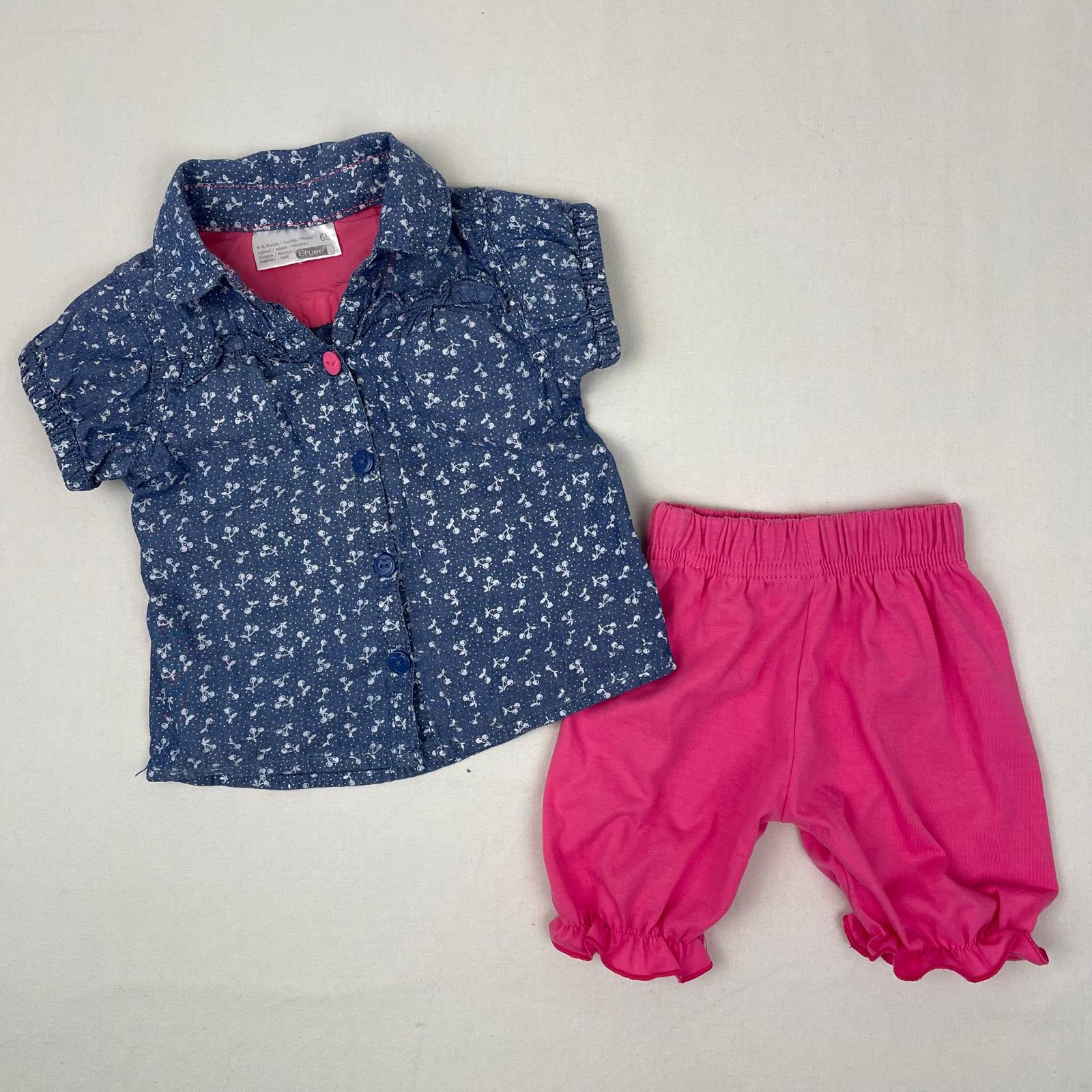 Autres commentaires : Ensemble 2 pièces : -1 chemise à manches courtes Ergee bleu en denim à imprimés cerise, avec boutons rose et bleu devant, emmanchures élastiques ; -1 pantalon sans marque rose fluo avec bas de jambe et taille élastiques.