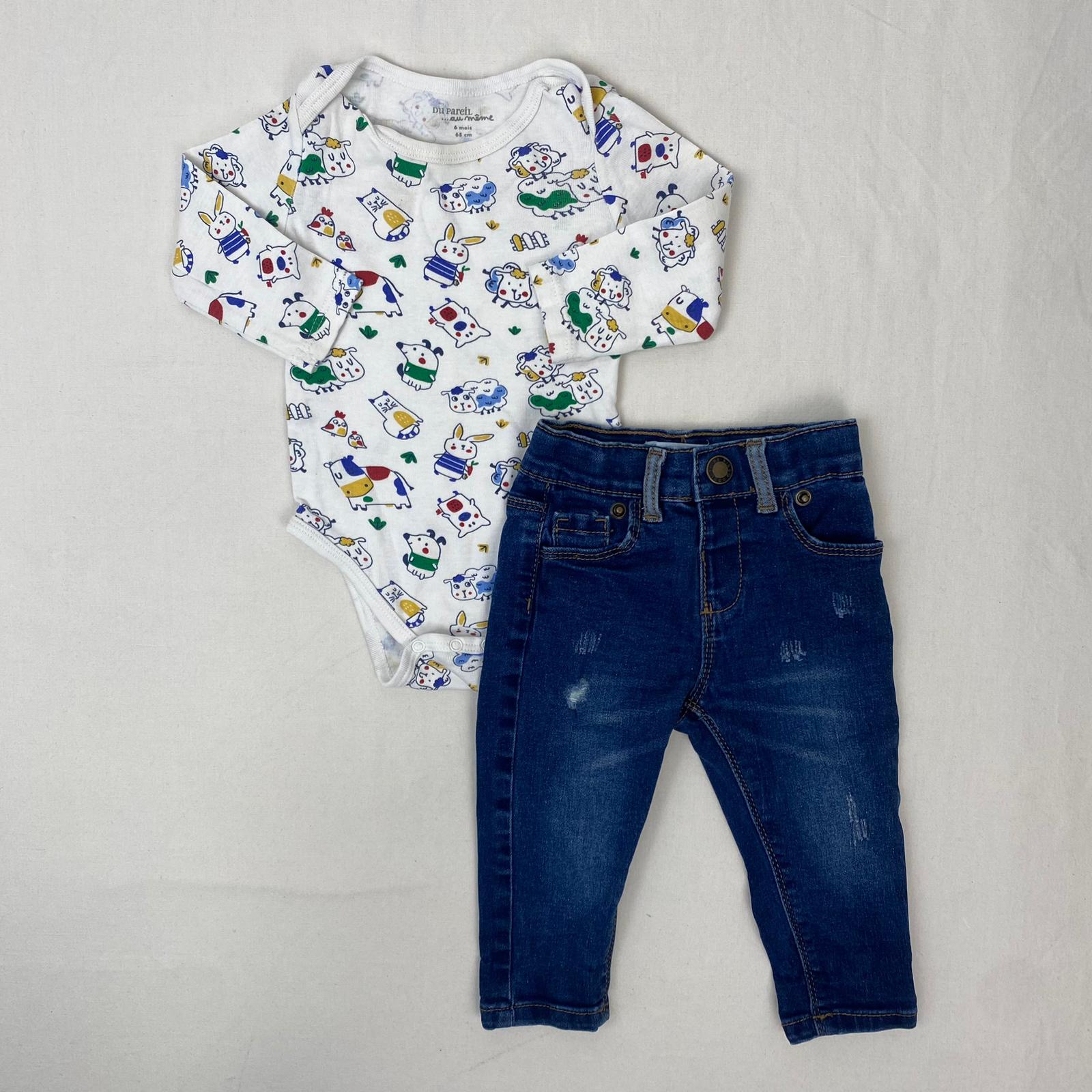 Ensemble 2 pièces : – body DU PAREIL AU MËME à manches longues blanc, parsemé d’animaux ruraux. -jean bleu PRIMARK, taille ajustable, fermeture par bouton de pression, ajustable par élastique intérieur.