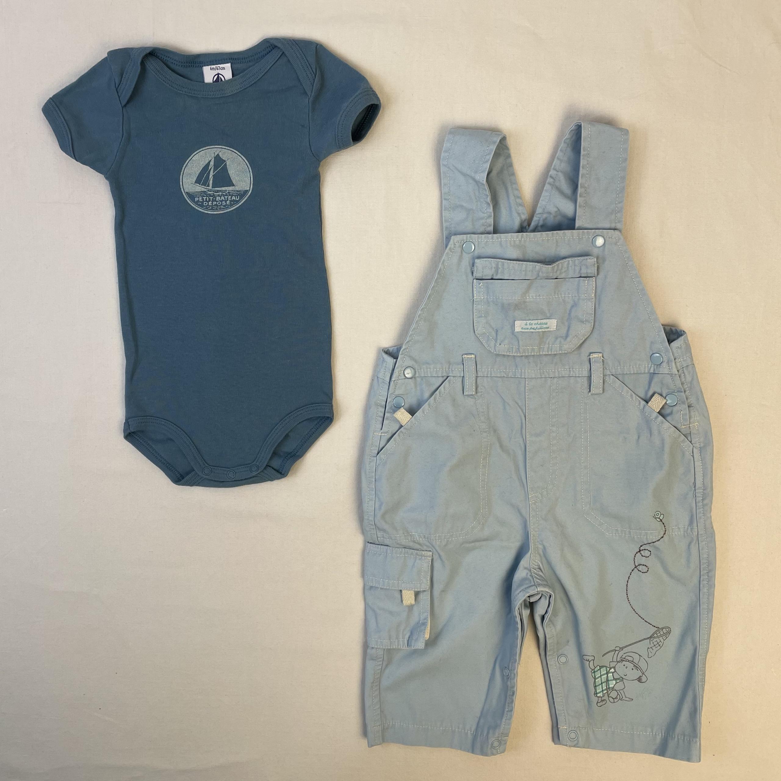 - Salopette blau clair, fermeture par boutons pressions sur les côtés, entre les jambes, et en haut; bretelles réglables, motif garçon attrape un papillon, petit défaut- bouton arraché.