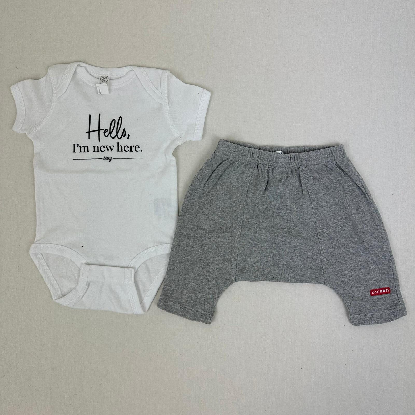 Autres commentaires : Body blanc Rabbit Skins manches courtes.Legging bleu La Redoute avec taille élastiquée.