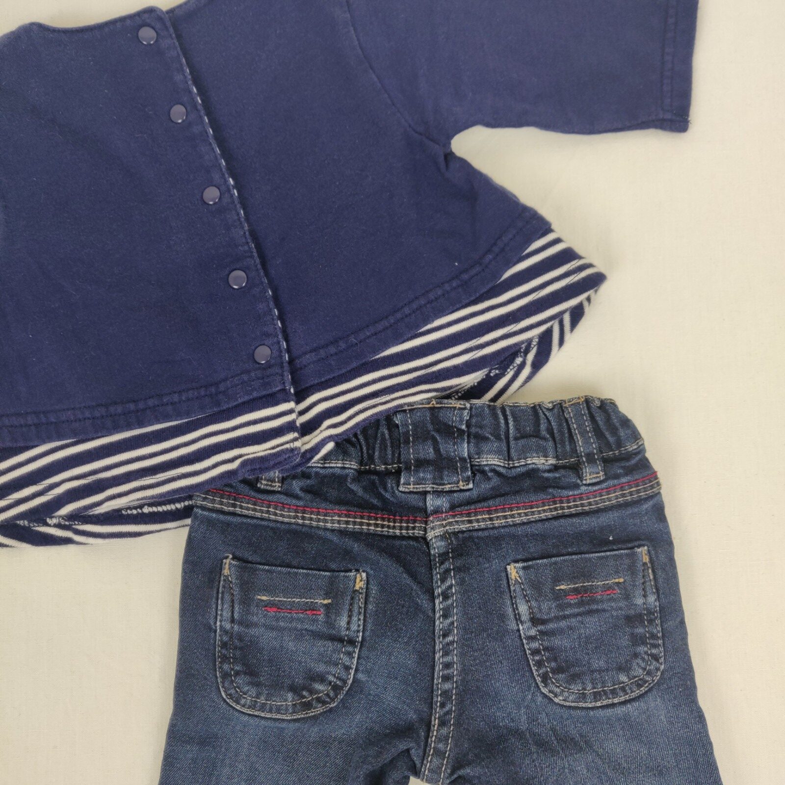 Autres commentaires : 2% elasthanne.Jean bleu foncée C&A avec taille élastiquée. Coton 100%: t-shirt manches longues bleu foncé Gymboree avec doublure et une fermeture au dos par boutons pressions.