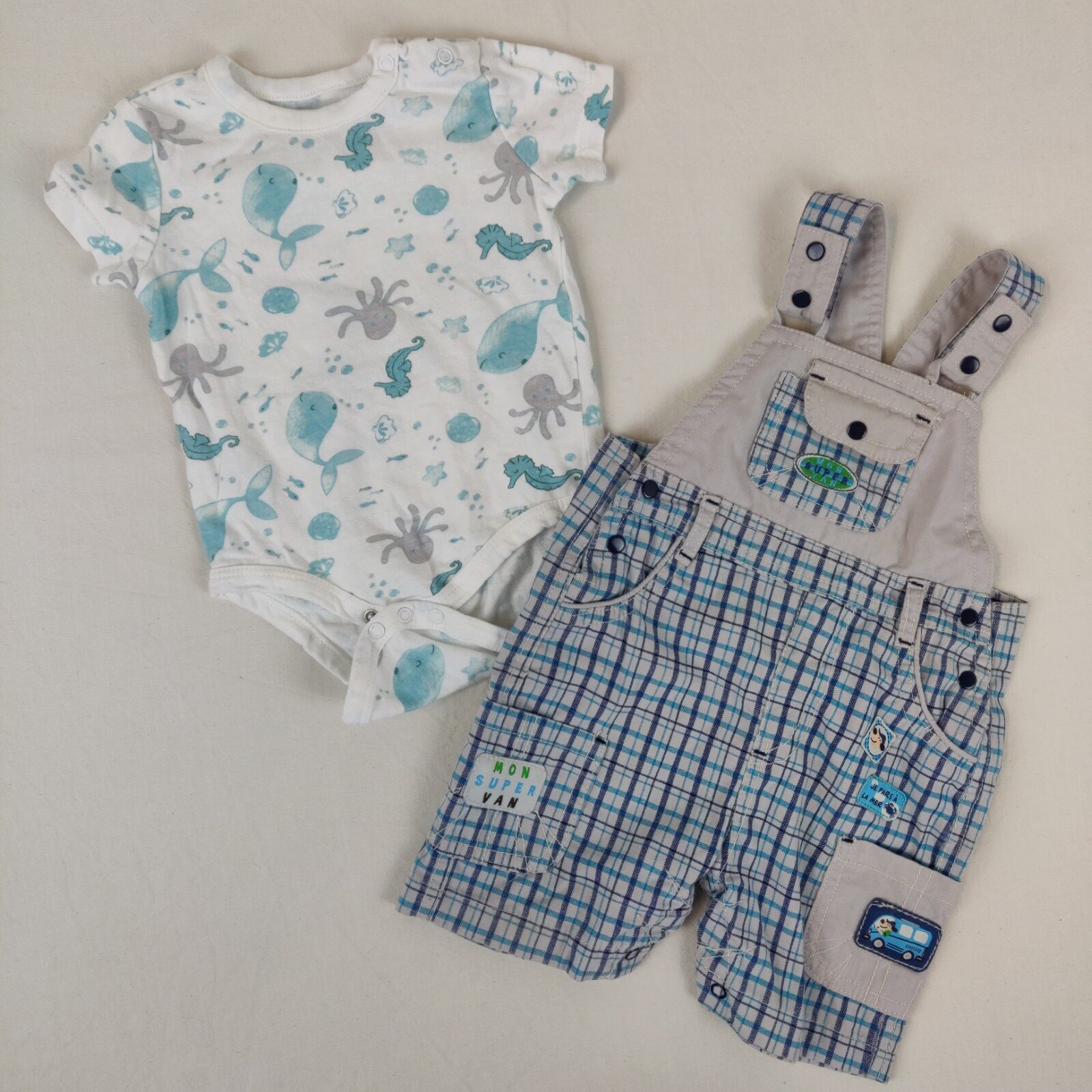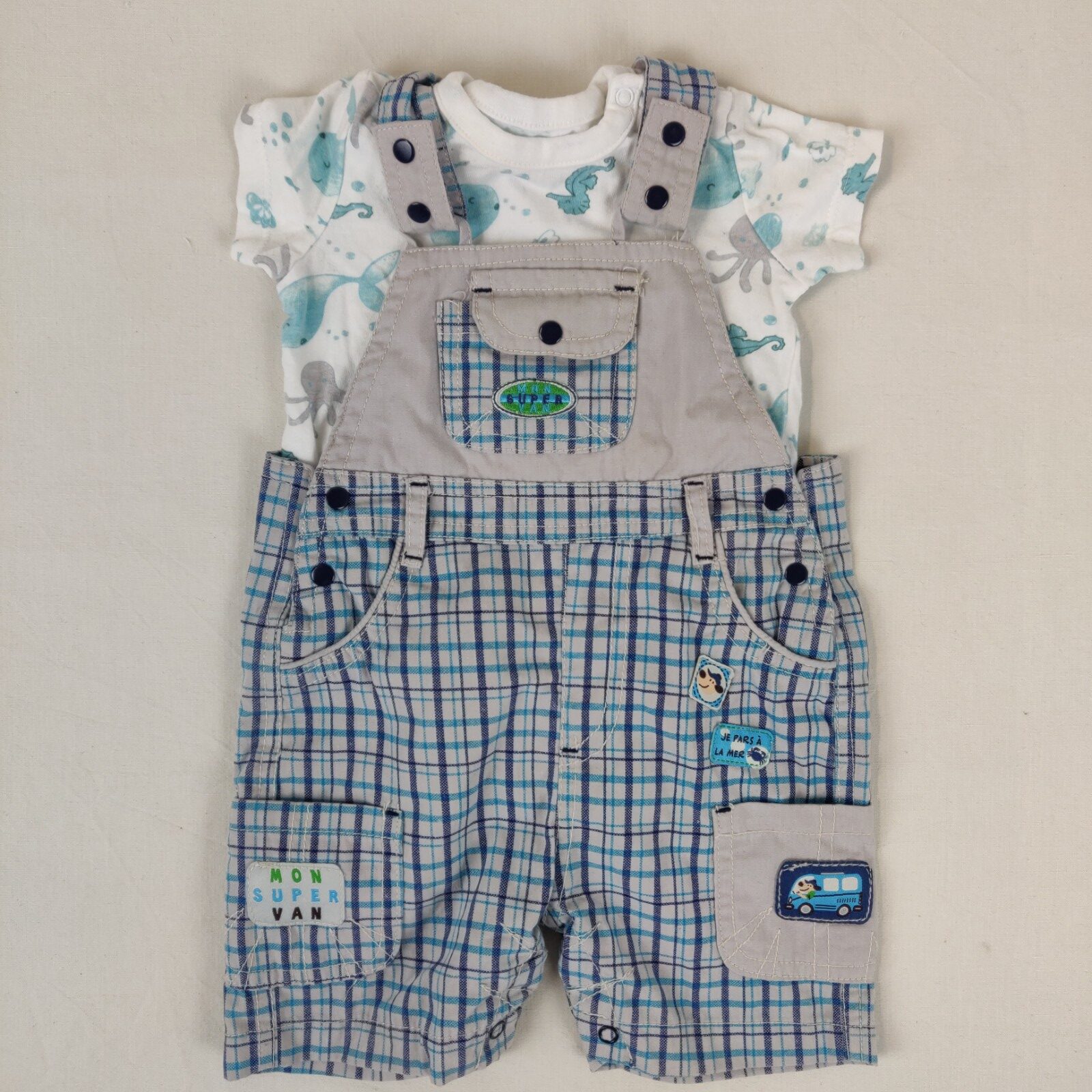 Autres commentaires : Ensemble 2 pièces. Un body à manches courtes So cute – blanc. Motifs animaux marins bleus. Une salopette courte sans marque sur le thème du voyage à la mer grise et bleue. Bretelles réglables à l’aide de pressions. Une pochette centrale. 2 poches latérales.