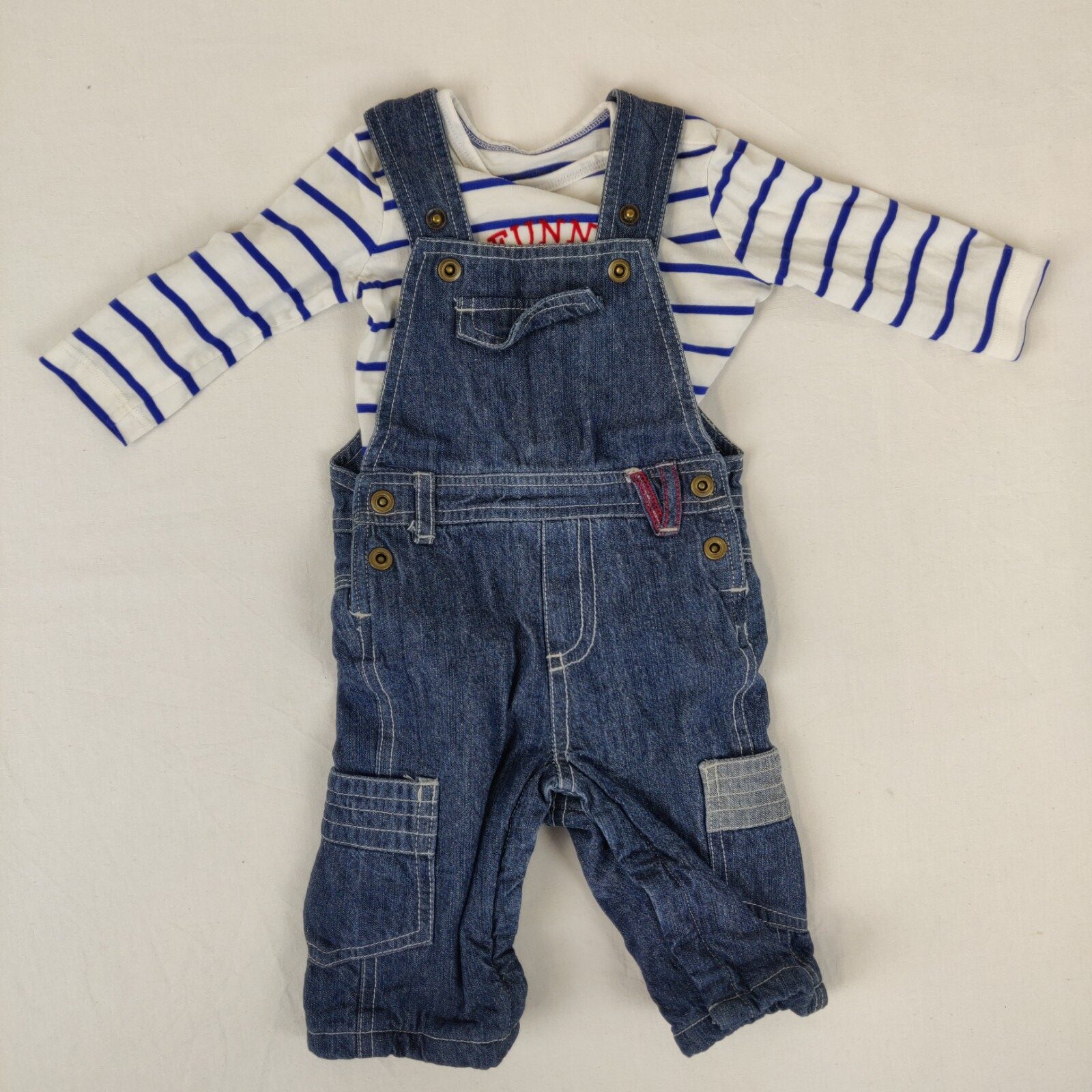 Autres commentaires : Ensemble 2 pièces. Un t-shirt à manches longues Bout’chou blanc à fines rayures bleues. Motif central chien acrobate rouge accompagné de l’inscription « Funny & speedy ». Ouverture latérale à 2 pressions. Une salopette Kitchoun en denim bleu. Bretelles réglables à l’aide de pressions. 2 poches latérales au niveau des jambes. Passants pour une ceinture.