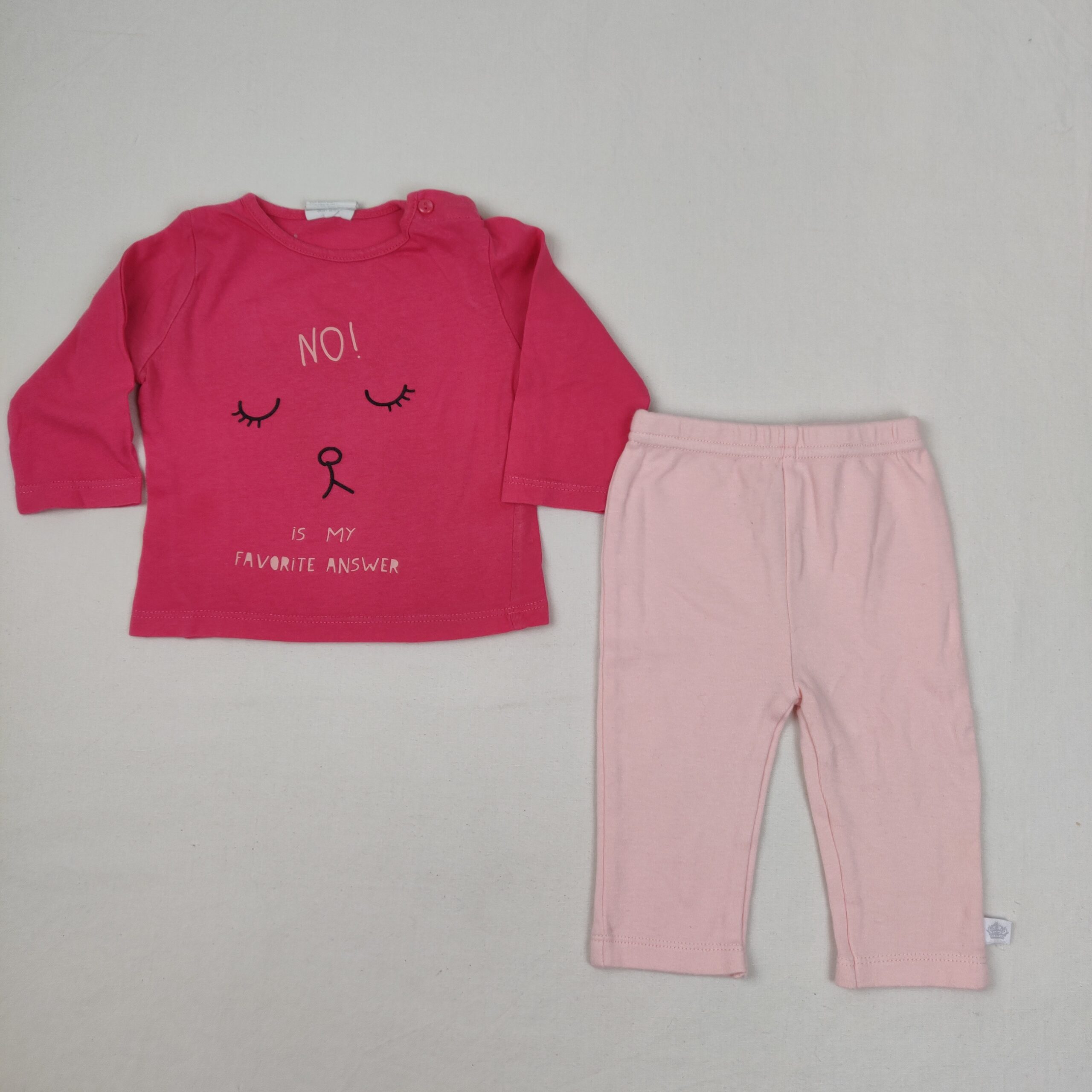 Autres commentaires : Ensemble 2 pièces dont – 1 pantalon Rosie Pope rose pâle, taille élastiquée – 1 t-shirt Kiabi rose corail , à manches longues, col rond avec ouverture par boutons classiques à gauche du col, inscription « No! is my favorite answer ».