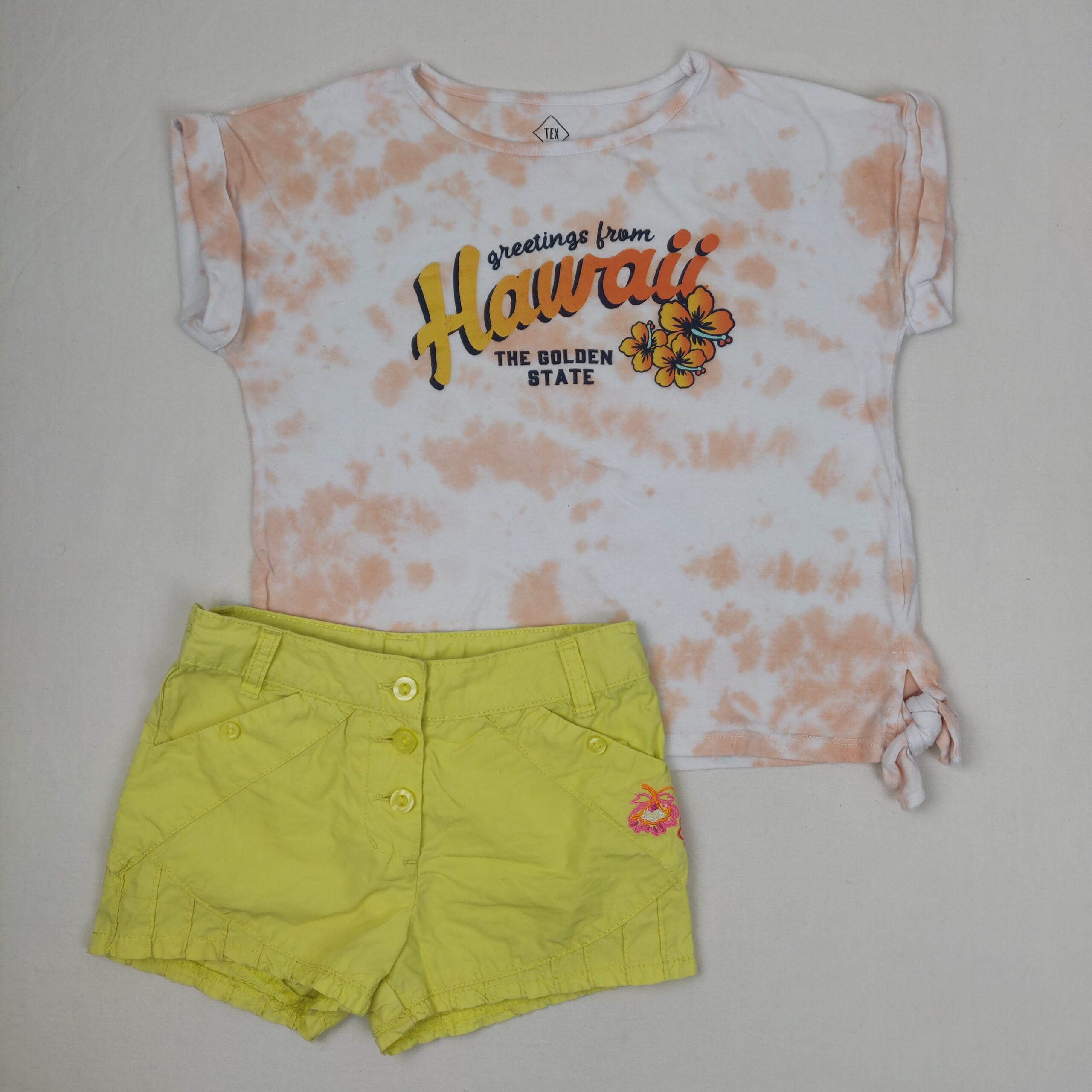 Autres commentaires : Ensemble 2 pièces dont – 1 short jaune Orchestra, fermeture par braguette 3 boutons, taille ajustable motifs fleurs roses et oranges en relief côté gauche. – 1 T-shirt Tex à manches courtes, à revers, blanc et orange, style tie & die, noué en bas côté gauche, avec Inscription orange « Greetings from Hawaii The golden state », motif fleurs exotiques
