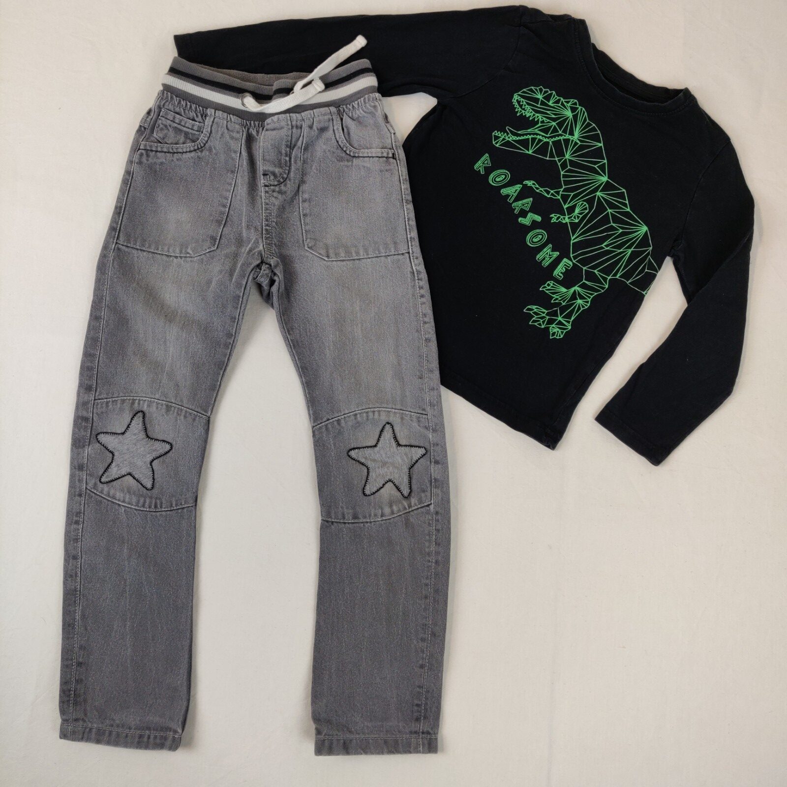 Autres commentaires : Ensemble 2 pièces. Un t-shirt à manches longues Primark – noir. Motif central dinosaure vert accompagné de l’inscription « roarsome ». Jean In Extenso en denim noir délavé. Taille façon tricot élastique avec cordon interne blanc. 2 poches latérales et 2 poches arrières. Etoiles de customisation au niveau des genoux.