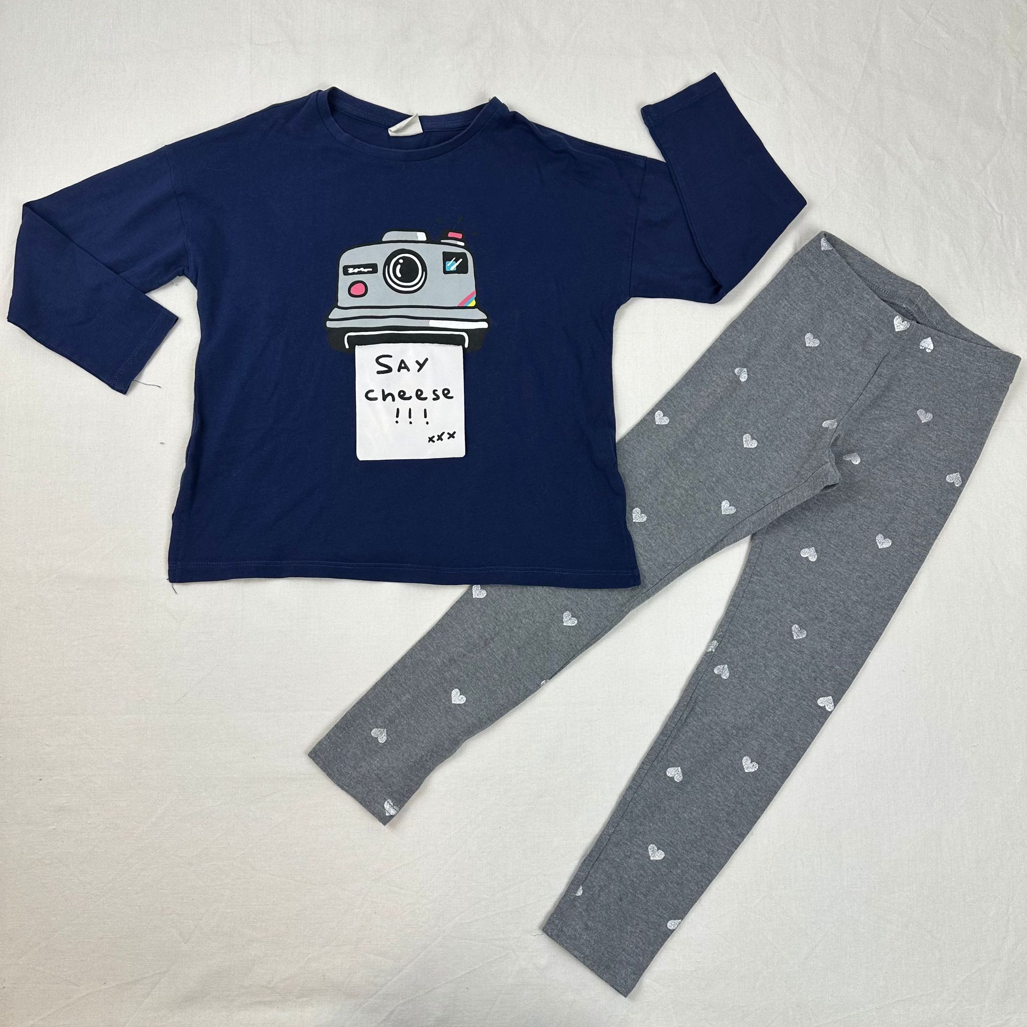 Autres commentaires : T-shirt manches longues Zara bleu foncé avec motif centrale un appareil photo. Legging Old Navy gris avec coeur argenté et taille élastiquée.