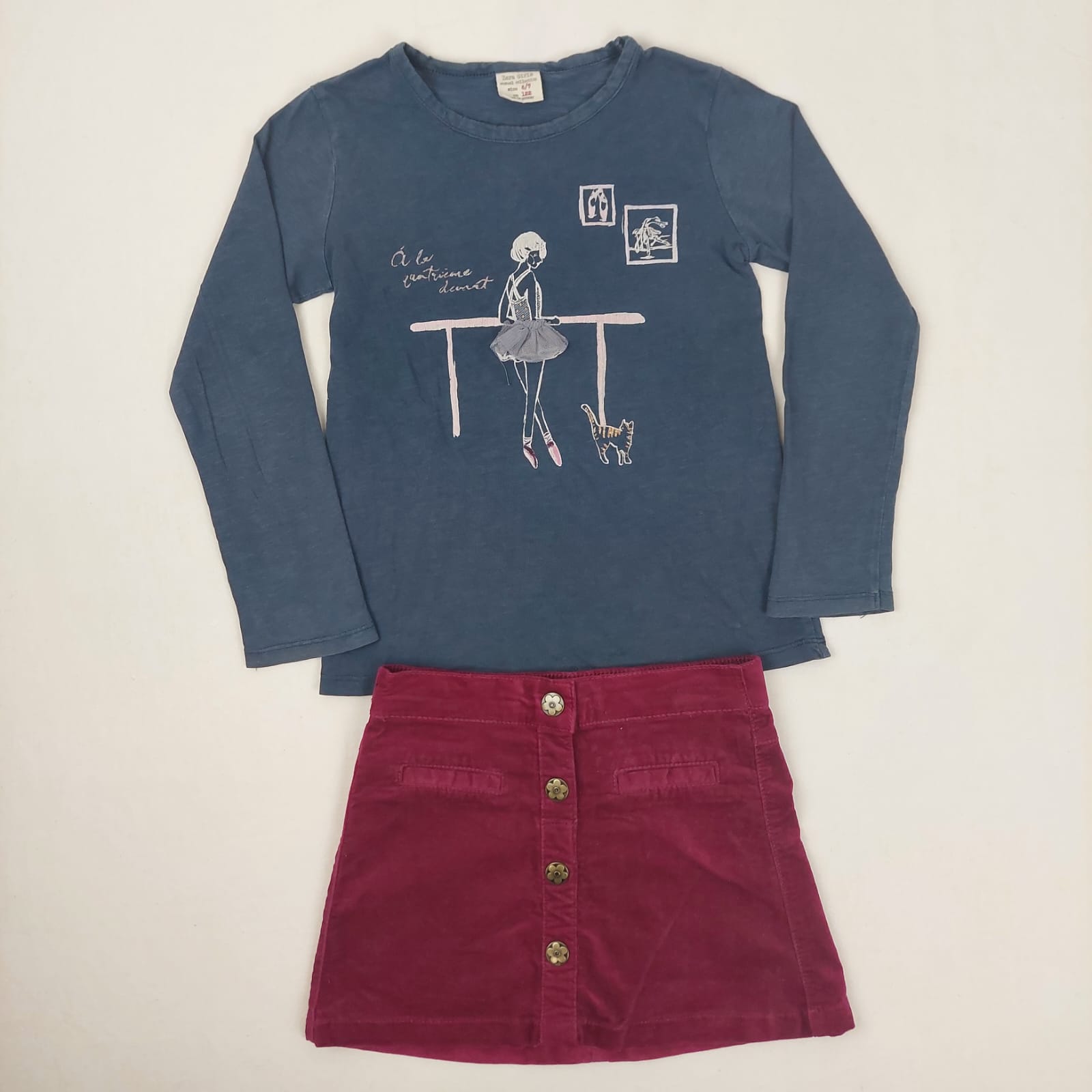 Autres commentaires : 100% coton, Zara T-shirt manches longues, bleu foncé imprimé danseuse ballet en rose. 2% elasthanne Jupe Palomino rose, taille élastiquée au dos, fermeture par un bouton pression central et boutons d’adornement sur le long de la jupe.