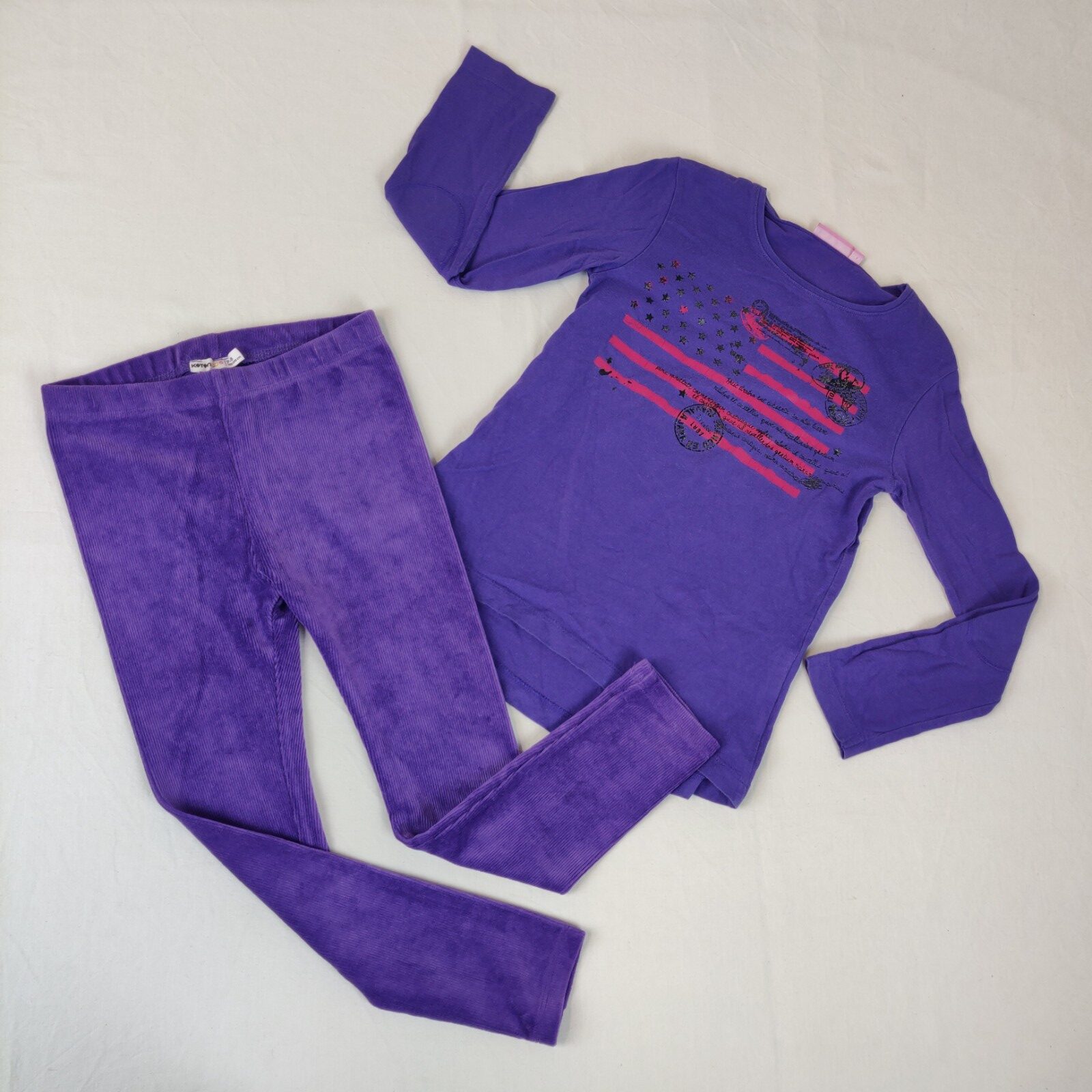Autres commentaires : Ensemble 2 piéces : t-shirt NKY violet longues manches avec des dessins à rayures rouges au milieu en coton 100%. Leggins velour Koton KIds violet avec taille élastiquée.