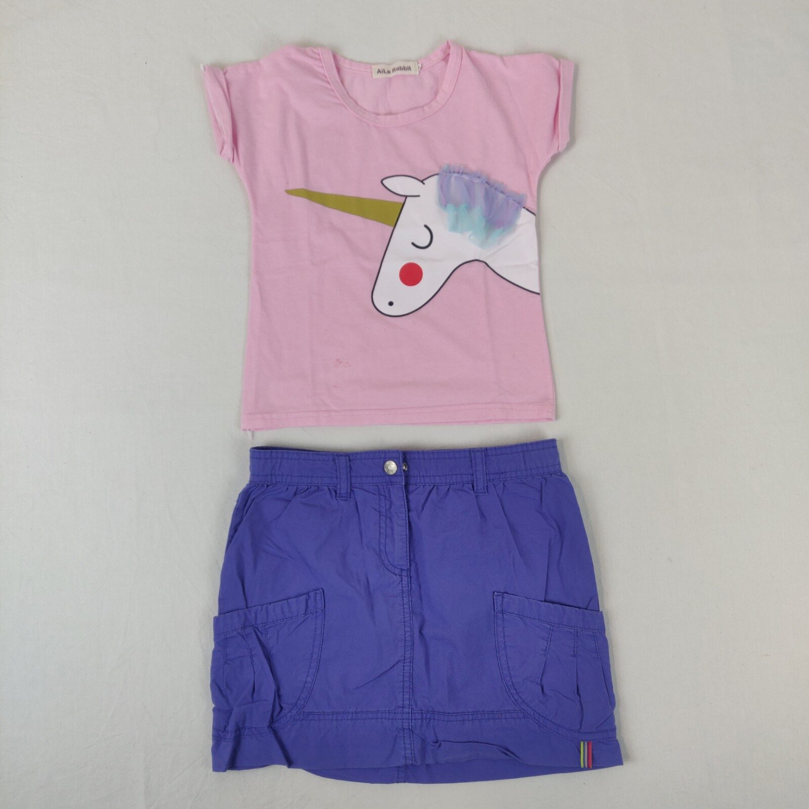 Autres commentaires : Ensemble 2 pièces. Un t-shirt Aile Rabbit à manches courtes – rose. Motif central piqué licorne. Deux tâches rouges dans le bas. Une jupe NKY – violet. Taille ajustable. 2 poches centrales. Passants pour une ceinture. Usure normale.