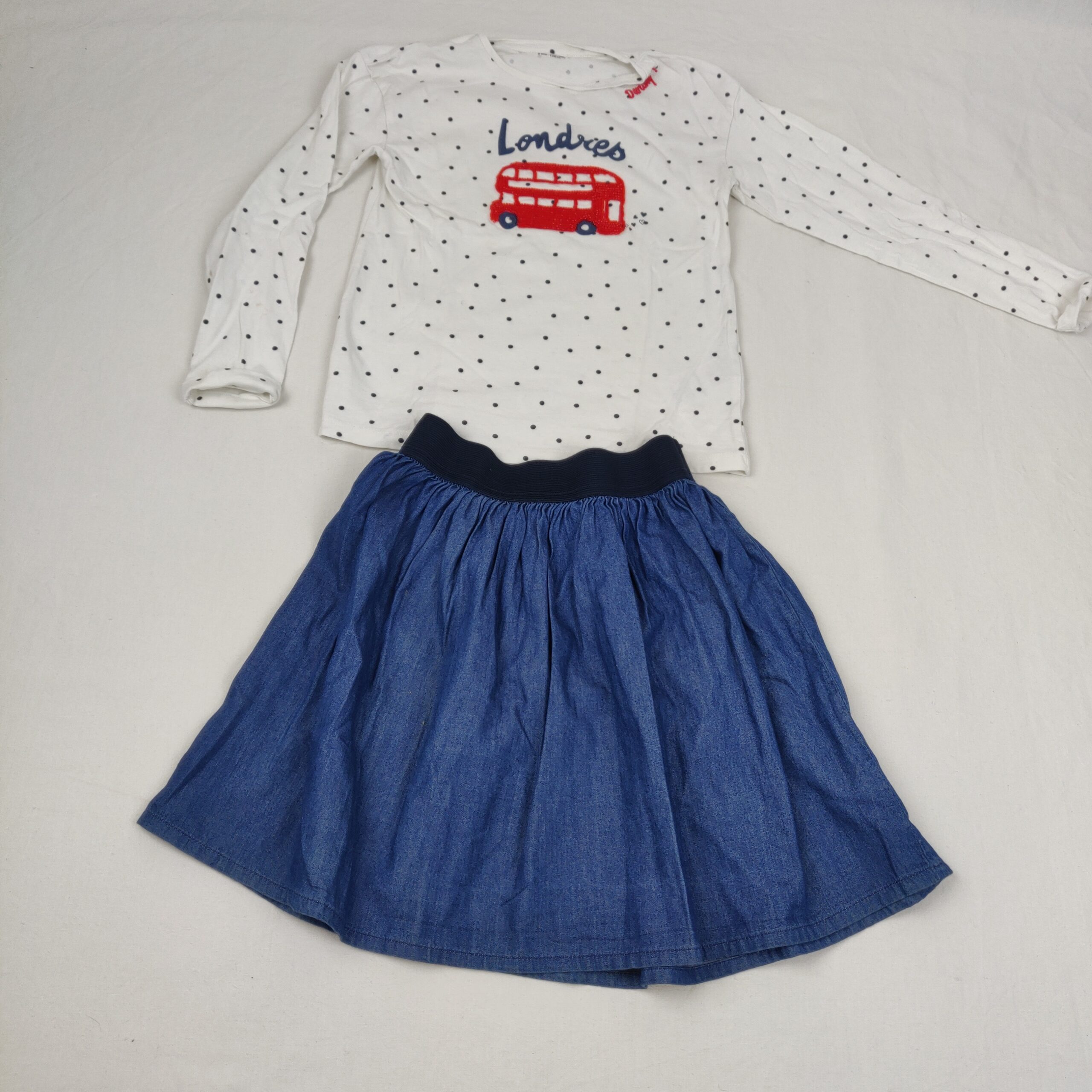 Autres commentaires : Jupe patineuse Monoprix Kids bleu denim légère avec taille élastiquée bleu foncée (100% coton et ceninture 7 % polyester et 22% élasthanne et T-shirt Orchestra (100% coton) manches longues, blanc à pois bleu foncé avec inscription en bleu Londres et Bus double anglais dessiné en perles rouges.