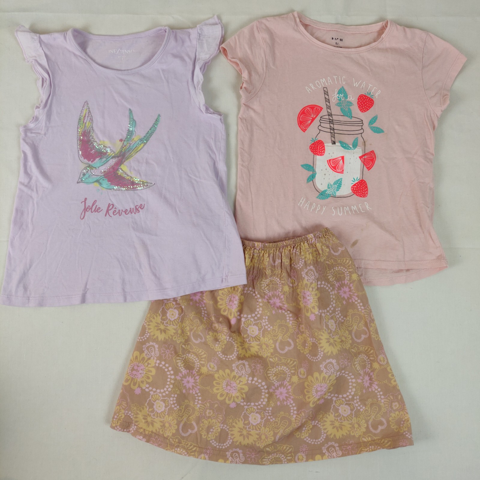 Autres commentaires : Jupe Tout compte fait – ocre-marron avec motifs floraux jaunes et roses – taille élastique. T-shirt In Extenso à manches courtes en tissu froncé – parme avec oiseau multicolore et inscription « jolie rêveuse » . T-shirt de marque « Kiabi » à manches courtes offert – saumon avec motif limonade. Tâche marron sur le bas du T-shirt.