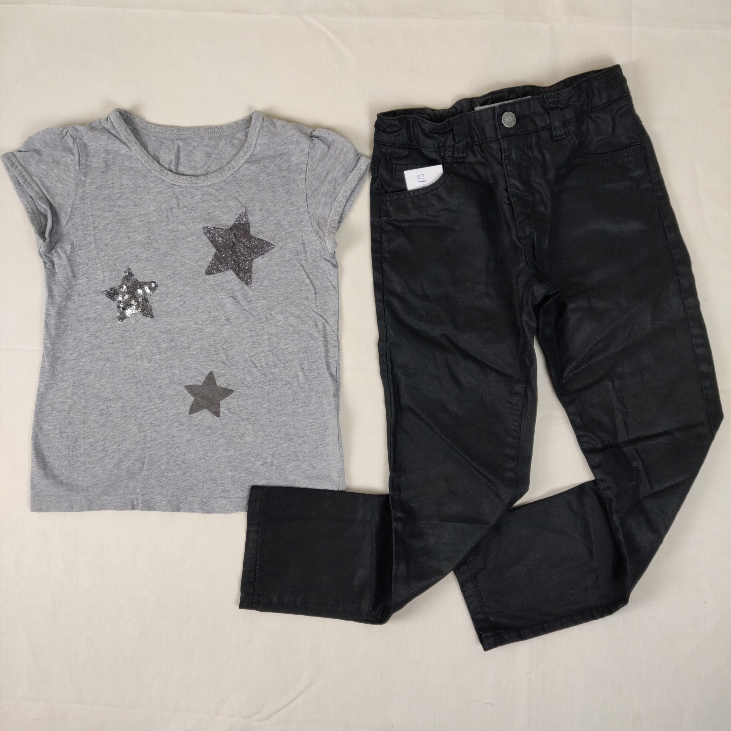 Autres commentaires : 1 Pantalon Monoprix noir moiré, habillé, fermeture par bouton métallique et zip – ceinture intérieure de réglage légèrement distendue et 1 tee-shirt manches courtes gris avec étoiles couleur argent ou métal sur le devant