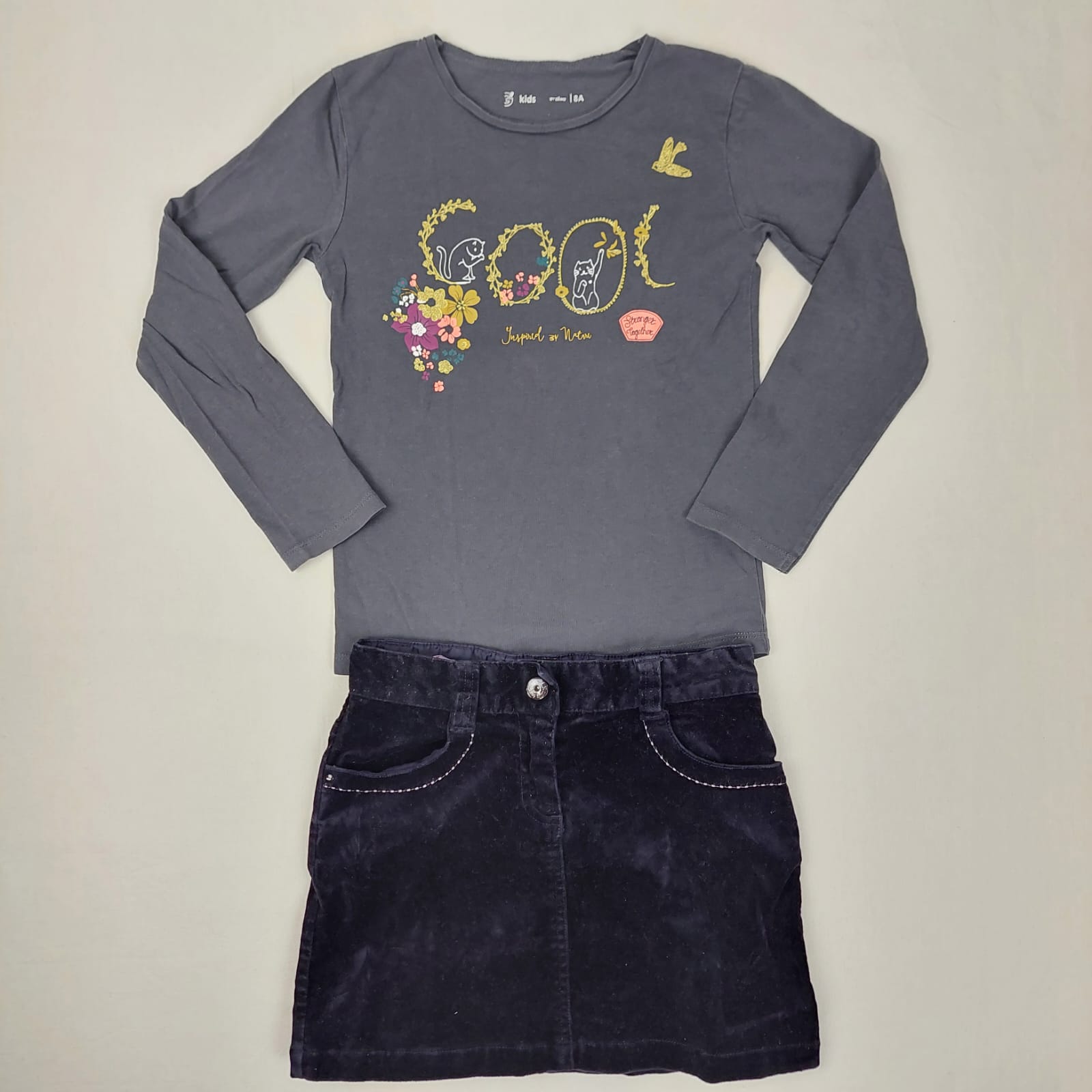 Autres commentaires : T-shirt manches longues Gémo violet imprimé « Cool » brillant, jupe A-line CFK violette en velours, poches avant, 2% élasthanne