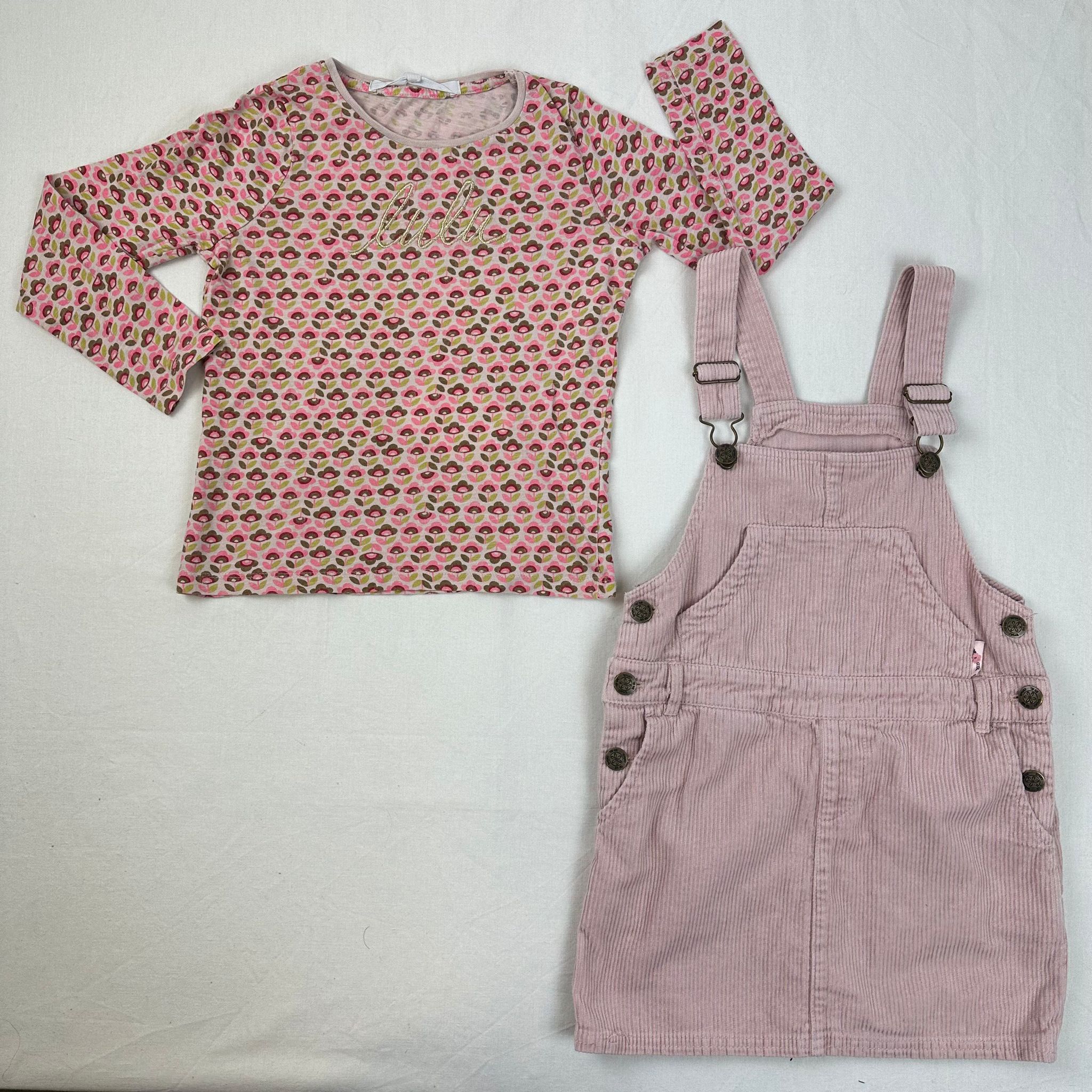 Autres commentaires : T-shirt Lulu Castagnette manches longues rose avec motif fleurale rose et vert.Salopette robe Tape à l’eoil rose en bretelles avec une fermeture sur les 2 côtés par boutons pressions.