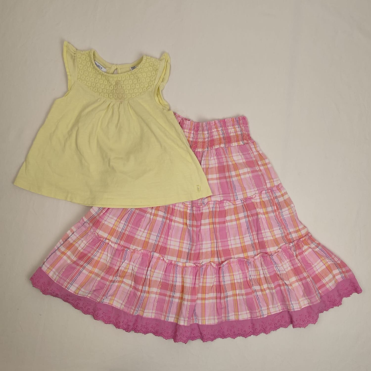 Autres commentaires : Ensemble 2 pièces : – Jupe longue rose volantée Tissaia, imprimé madras, en bas bordure dentelée unie rose fuchsia, ceinture froncée et élastiquée, doublure rose 100% coton. T-shirt jaune sans manches Okaïdi, fermeture par un bouton en haut du dos, mini volants sur les épaules, col rond, petites fleurs brodées ton-sur-ton au niveau de l’encolure.