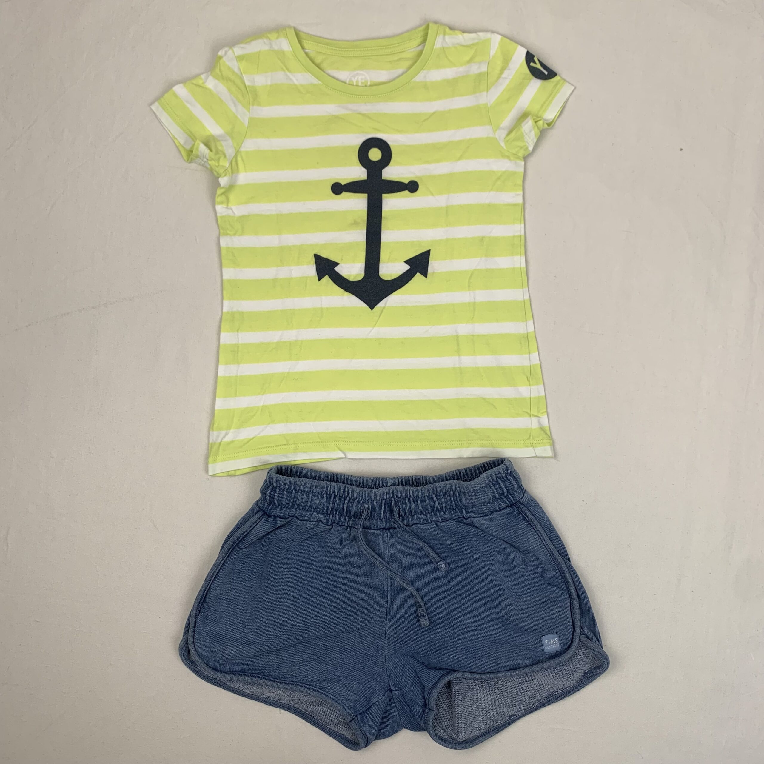 Autres commentaires : Ensemble 2 pièce: -T-shirt YE Collection à rayures blanches et jaunes à manche courtes,cio rond, motif ancre noir, 100% coton. -Short bleu Tape à l’œil, large taille élastique avec lacets.