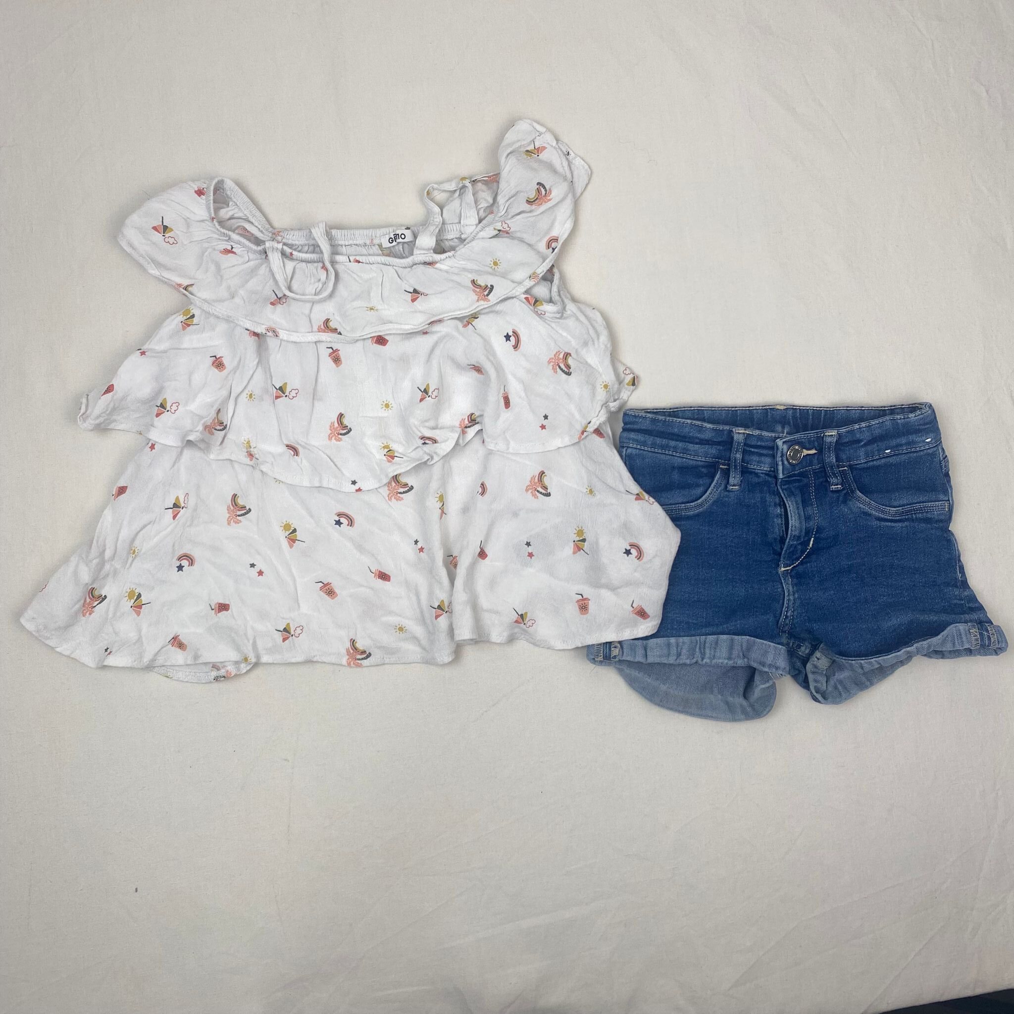 Autres commentaires : Viscose 100% pour le haut, 84% coton, 15% polyester, 1% élasthanne pour le bas, Ensemble 2 pièces : – Une robe courte gémo blanche à bretelles, – Un short bleu foncé H&M, fermeture par boutons et zip